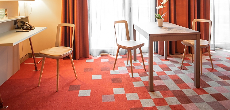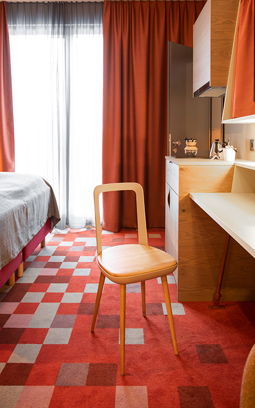 Zimmer und Flure greifen das Pixelthema am deutlichsten auf: Der eigens für das Hotel entworfene Teppich zeigt einen farbigen Pixelverlauf, der sich vom Boden bis hoch an die Wände zieht. In den Zimmern löst sich das Pixelmotiv des Teppichbodens zur Stirnseite hin auf. Verschiedene quadratische Paneele folgen der Pixeloptik und prägen die übrigen Wände und maßgefertigten Einbauten aus Holz und Schichtstoff.