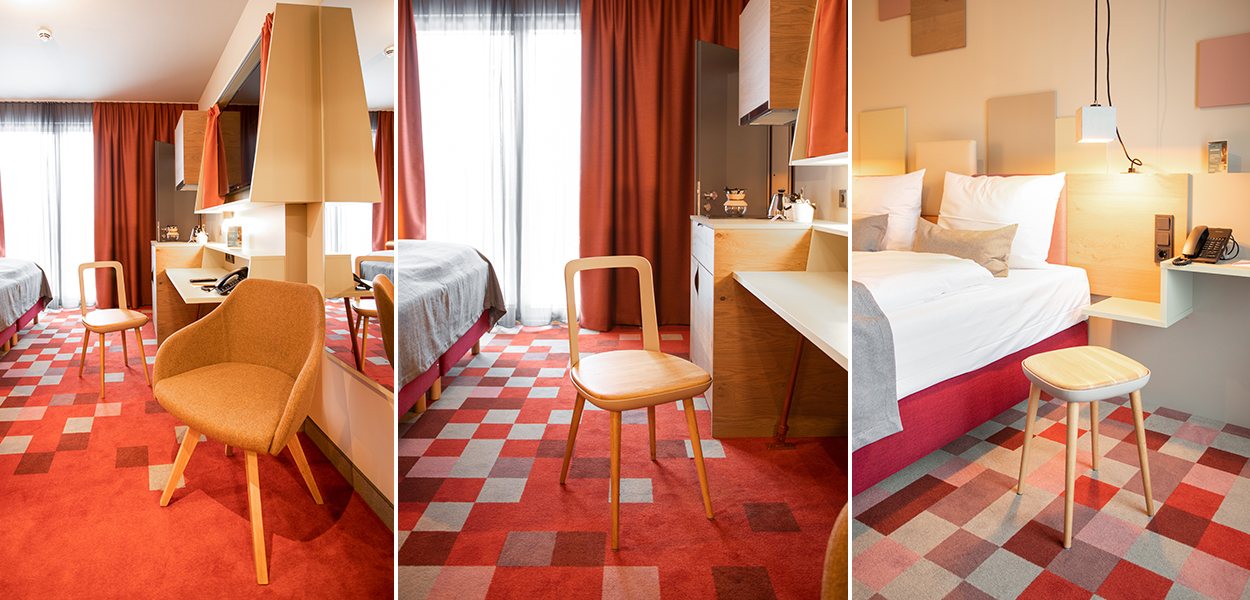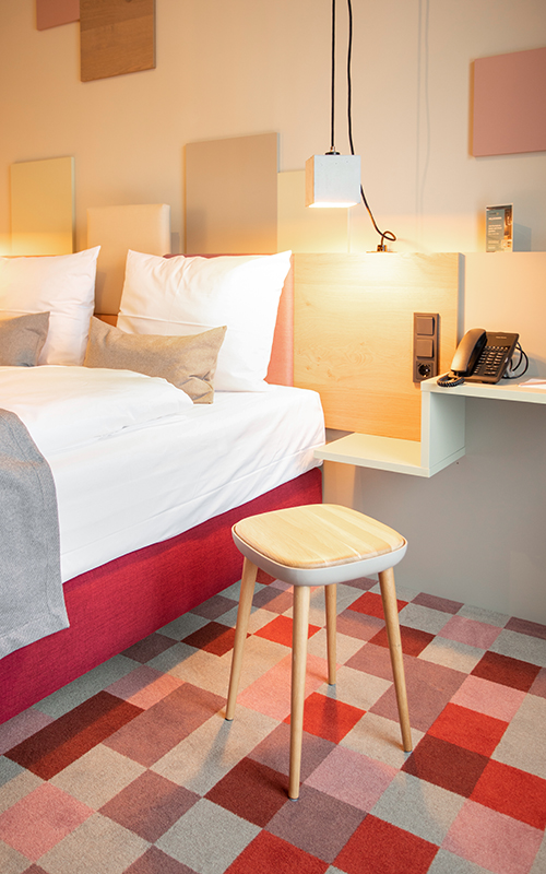 Die 73 Zimmer sind barrierefrei, acht davon rollstuhlgerecht. Zwölf Zimmer sind mit einer Mini-Küche ausgestattet und können für Long-term-Aufenthalte gebucht werden. Wichtig war den Innenarchitektinnen Andrea Kraft-Hammerschall und Selina Salgueiro allerdings, die Barrierefreiheit so unauffällig und selbstverständlich wie möglich in die Räume zu integrieren. Zentrale Aspekte wie eine leichte Orientierung laufen deshalb vor allem über Farben: So sind die einzelnen Etagen durch deutlich voneinander abgesetzte Farbzonen charakterisiert: in grün, blau und rot.
