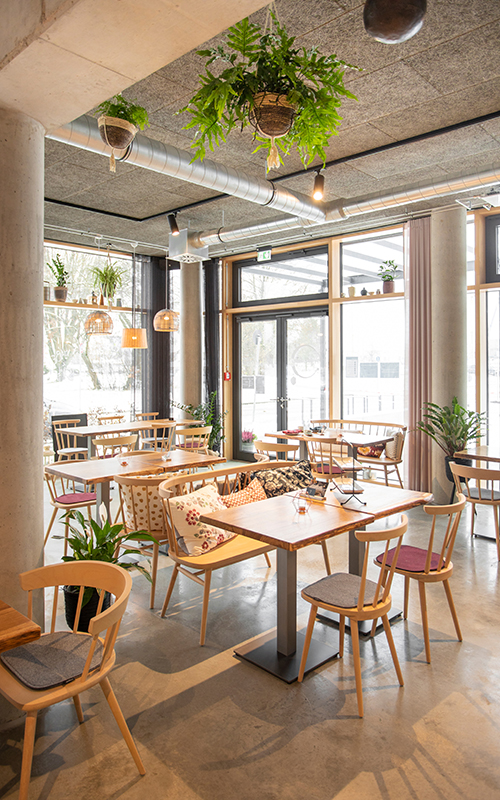 Verschiedenfarbige Stühle, Tisch- und Sitzgruppen zonieren den offenen Bereich. Trotzdem wirkt der Raum nicht kleinteilig, sondern lässt sich leicht als Ganzes erfassen. Stahl, lasierte OSB-Platten und Polster fügen sich stimmig zu einem Gesamtbild zusammen. Einen besonderen Akzent setzt der geschliffene, offen liegende Estrich: Er unterstreicht die unbefangene Unkompliziertheit des Hotels.