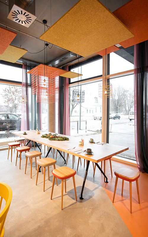 "Viele unterschiedliche Pixel ergeben ein stimmiges Ganzes. Nur wenn alle ihren unterschiedlichen Beitrag einbringen, wird das Bild komplett", erklärt Innenarchitektin Andrea Kraft-Hammerschall, Mitgeschäftsführerin des ausführenden Architekturbüros Dreimeta. Die Einrichtung ist eine bunte Farb- und Materialcollage. Der bunte Farbkanon ist mutig, aber niemals laut.