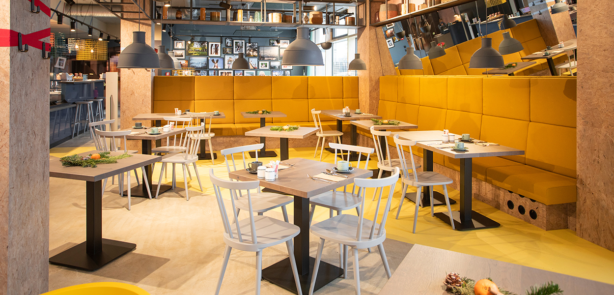 In der Frühstücks- und Loungezone ist das Gestaltungsprinzip des Pixels zu quadratischen Rastern aufgelöst. | Fotos: WagnerLiving