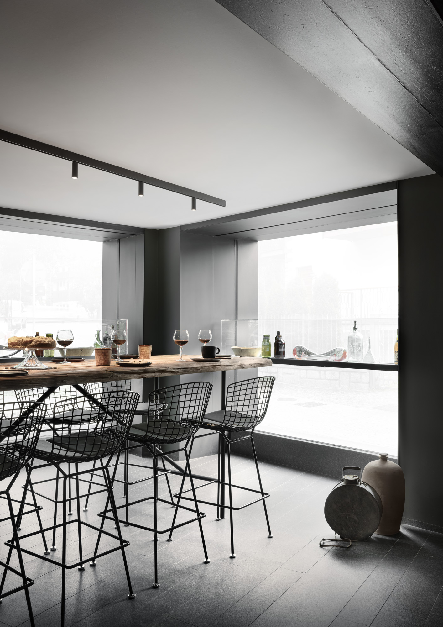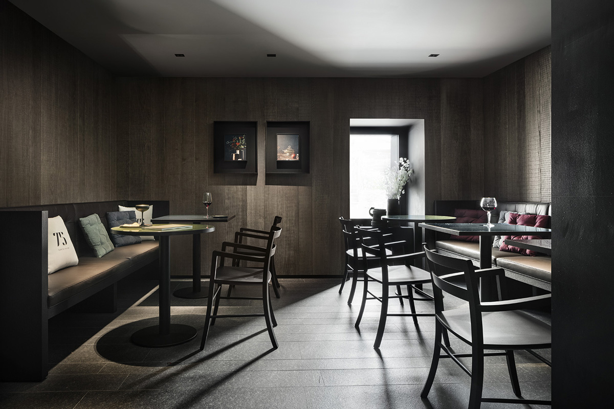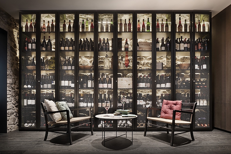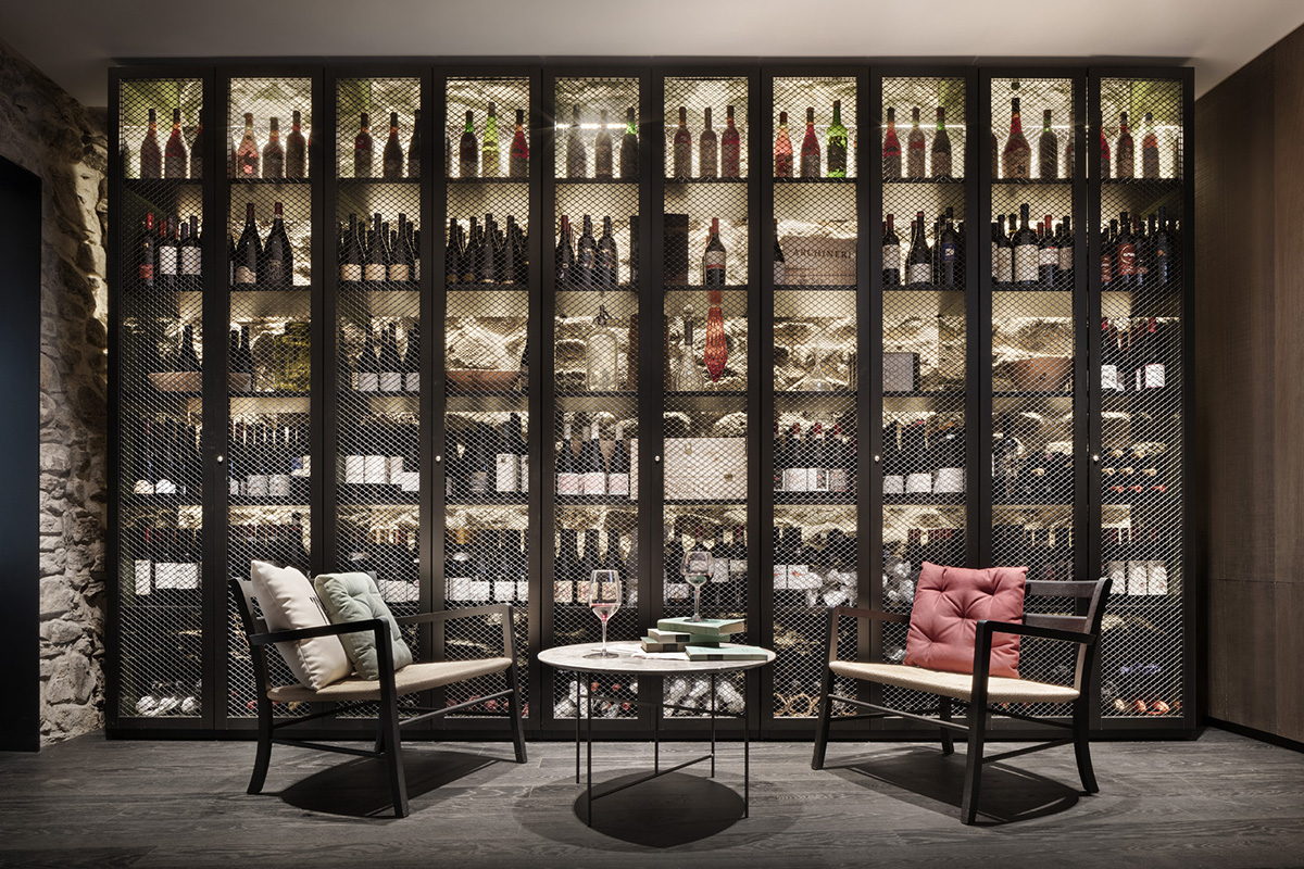 Dagegen lässt die sorgfältig kuratierte Bar mit Weinsammlung im vollverglasten Kühlschrank, die Drahtgittervitrinen, der Bodenbelag aus gebürstetem Granit und klar akzentuierte dekorative Elemente an die Eleganz norditalienischer Städte denken.