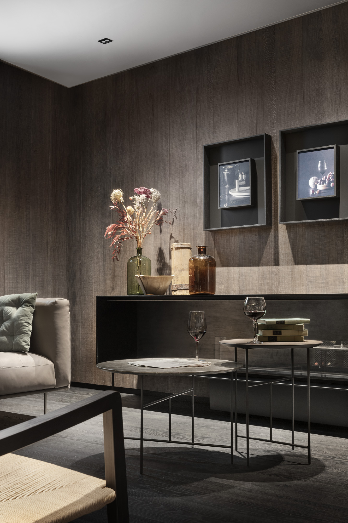 Dazu trägt auch die Verwendung von warmem Holz und grobem Naturstein für die Wand-gestaltung bei, die mit monochromen Wandflächen, minimalistischen Möbelobjekten und der dezenten Lichtführung kontrastieren.