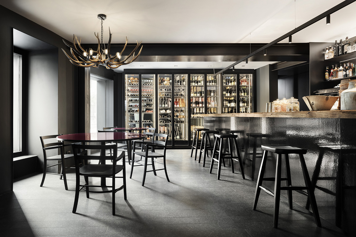 Dieser ist in drei Kompartimente unterteilt – die Bar mit Theke, ein zentraler Raum mit Tischen und Bänken sowie eine angrenzende Lounge –, dass zugleich die intime Atmosphäre einer Berghütte gewahrt bleibt.