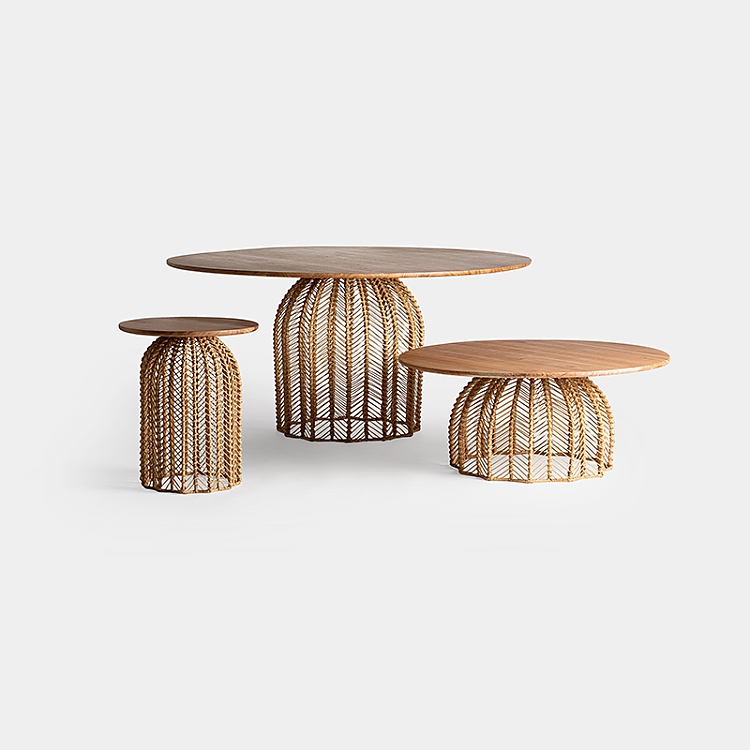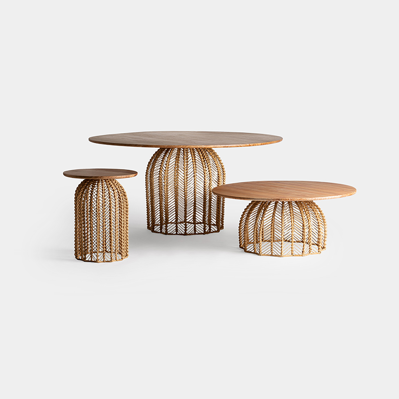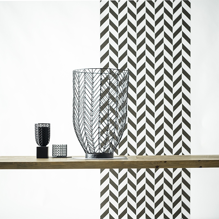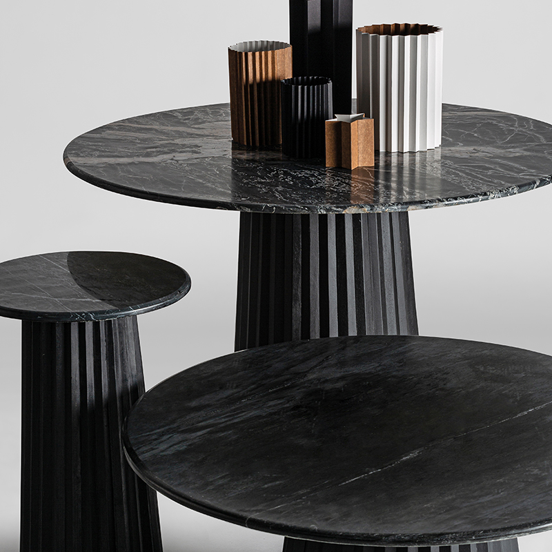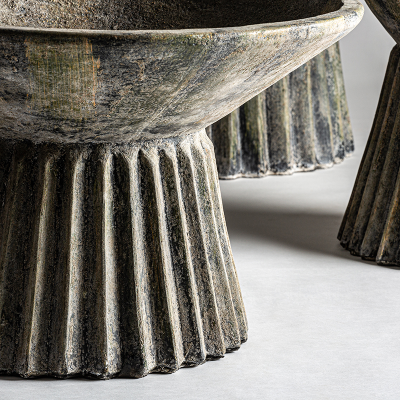 Am offensichtlichsten von dieser Plissétechnik inspiriert, sind die Produktlinien "Plissé Wood" und "Plissé Stone": Die konischen Sockel aus massivem Echtholz bzw. grobem Naturstein zeigen eine Faltengeometrie, die stark am Faltenwurf des Kleids orientiert ist, allerdings sind die Falten deutlich breiter und wirken so weniger streng. Beide Linien, die der Konsoltische und die der Blumentöpfe, sind als Ensemble konzipiert. Denn die Dynamik der Liniengeometrie entfaltet sich erst in der Zusammenschau verschiedener Aufskalierungen.