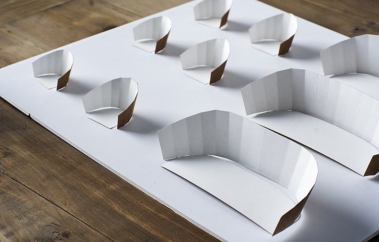 Teil des Designprozesses war die intensive Auseinandersetzung mit der handwerklichen Plissétechnik Fortunys. Einer der Analyseschritte bestand darin, das Plissé als Falttechnik auf Papiermodelle zu übertragen. Weitere Materialwechsel folgten. So übertrug Ferrero den Faltenwurf zunächst analog zum Vorbild der Marmorstatue aus Delphi auf harte Materialien wie Naturstein und Massivholz.