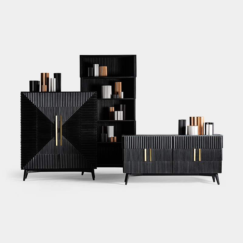 Fortgeführt wird das Plissé in den Holzfronten der Sideboards, Garderobenschränke und Kommoden oder in den Regalrücken des Bücherboards der Serie aus Mangoholz und Marmor.
