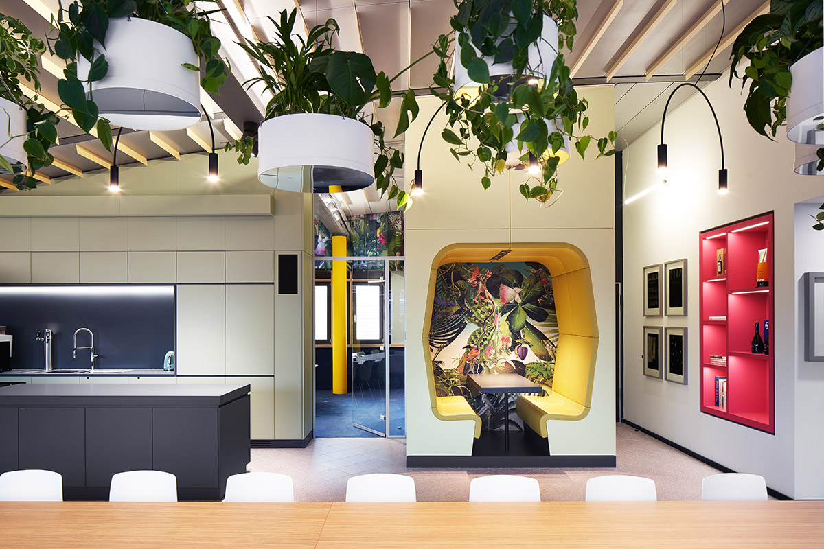 Der Arbeitsplatz als Sehnsuchtsort: Die Agenturräume von Roman Klis in Herrenberg verströmen tropisches Flair. Frische Farben, exotische Wallcoverings, sprudelnde Wasserquellen, mehr als 2000 Grünpflanzen und raffiniertes Licht verbreiten gute Laune. Ein wichtiger Quelle für die Entwicklung des Einrichtungskonzepts waren die Erkenntnisse der Verhaltenspsychologie.