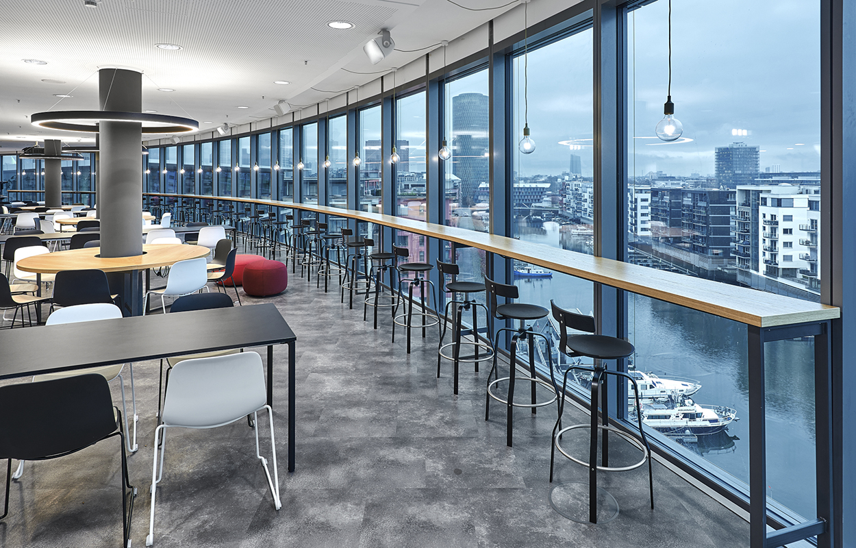 Frankfurts längste Theke befindet sich im Hafenbogen, im neuen Büro von Dentsu Aegis Network. Fotos: Axel Krantz