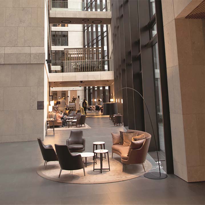 Die integrierten Bürobäder sind nur ein Merkmal der Design Offices Nove by Citterio am Arnulfpark in München. Schon im Erdgeschoss herrscht ein Flair, das dem einer Luxuxhotel-Lobby ähnelt. Das Gebäude biete der Work-Life-Balance der rund 1.300 Mitarbeiter verschiedener Unternehmen eine Infrastruktur, sagt Architekt Antonio Citterio. Herzstück ist das großzügige, über die gesamte Höhe verglaste Atrium, die vier Haupteingänge verleihen dem Komplex einen öffentlichen Charakter. Die hochwertigen Materialien und die lichte Höhe der Büroetagen verleihen Eleganz.
