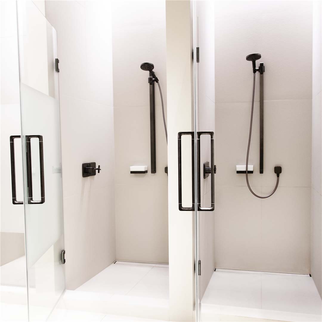 Für die Armaturen und Brausen griff er auf seine eigene, für die Marke Axor gestaltete Kollektion zurück, nämlich "Axor Citterio E". "Axor" ist eine Marke der Hansgrohe Group. Für deren Veredelung wählte er die "Axor FinishPlus"-Oberfläche "Brushed Black Chrome".