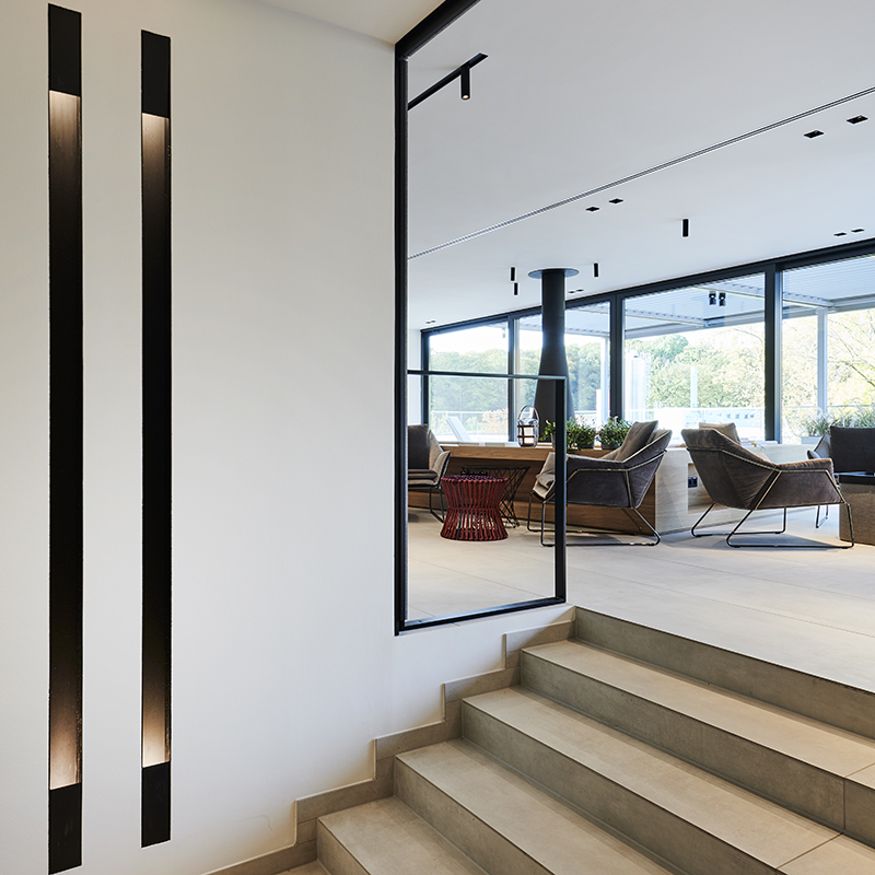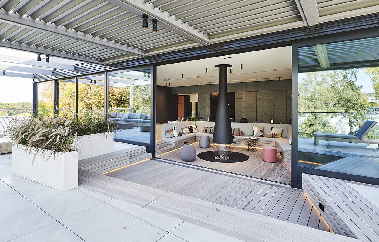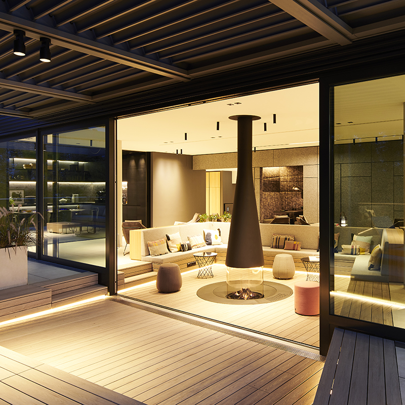 Der zentrale Bereich mit Loungemöbeln und offenem Kamin ist zugleich Ruhepol und Meetingzone. Eine in den Boden eingelassene Sitzlandschaft verbindet Innen- und Außenraum und lädt zum Relaxen oder zu "Lagerfeuergesprächen" ein.