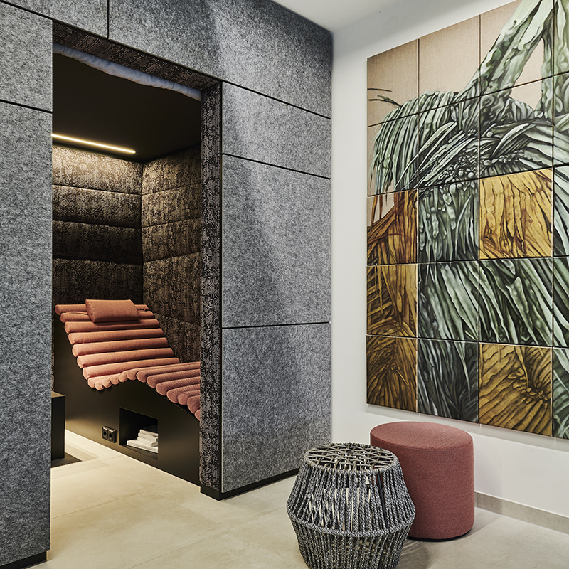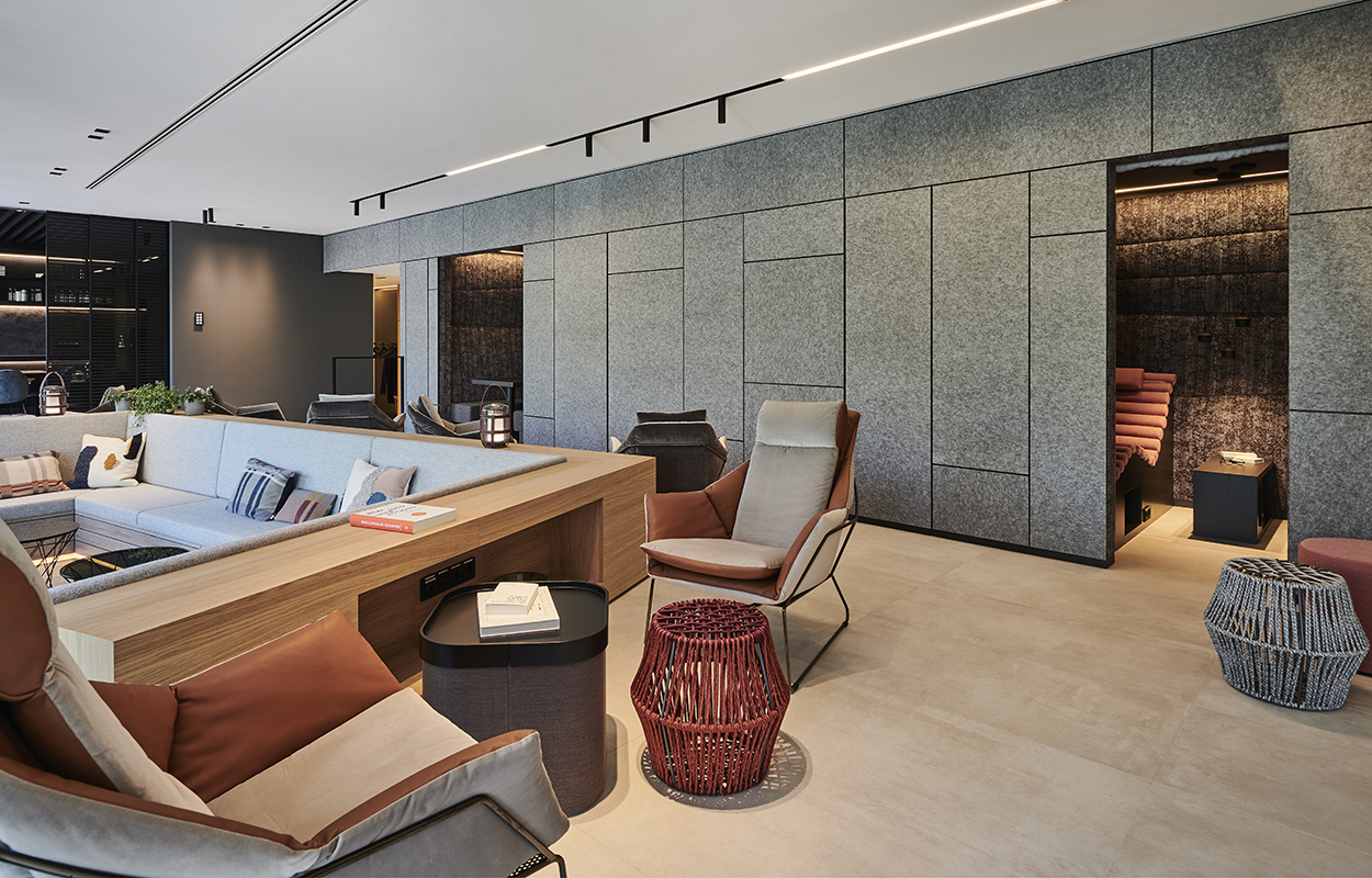 Die Raumstruktur beruht auf fließenden Übergängen. Die Lounge gliedert sich in verschiedene, miteinander verwobene Funktionszonen und öffnet sich mit großen Glasflächen zur anliegenden Dachterrasse. Dort setzt sich der wohnliche Charakter mit einladenden Sitzlandschaften fort.