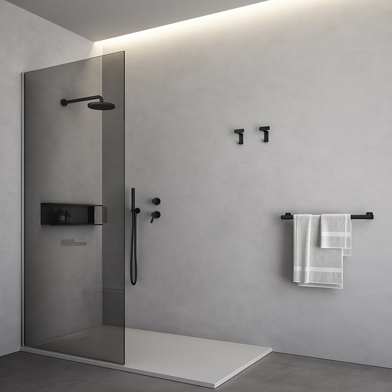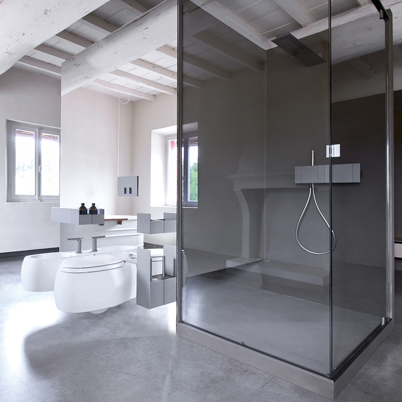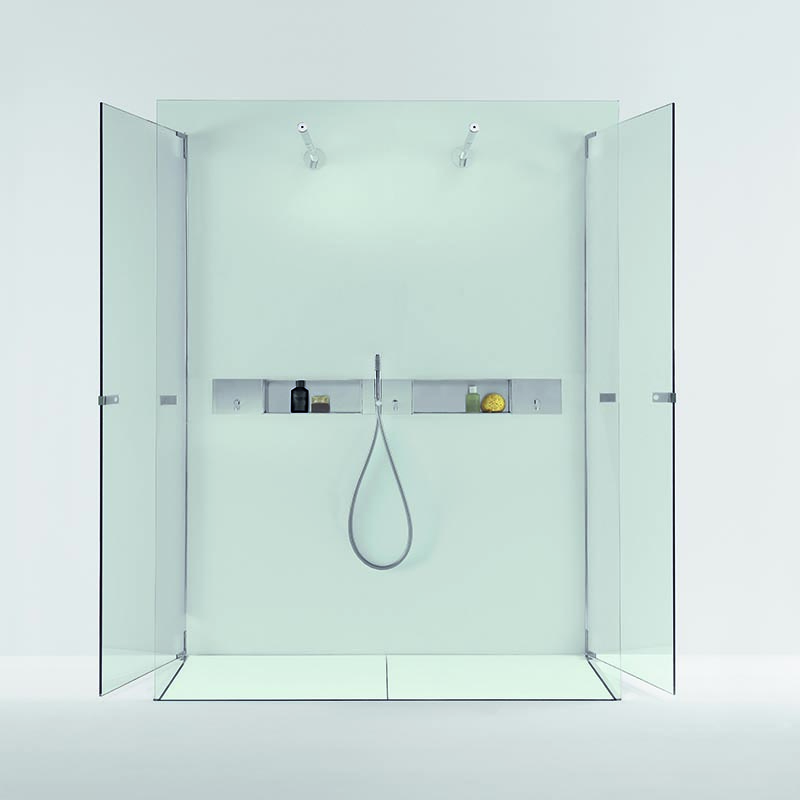 Die Stauraumdusche "Plan-a" von Agape verzichtet auf markante Elemente, um sich umso unauffälliger in die umgebende Architektur einzufügen. Zu erkennen ist die Designhandschrift von Mario Tessarollo und Giulio Gianturco allein über präzise Linien aus gebürstetem, eloxiertem Aluminium in Schwarz oder Grau.