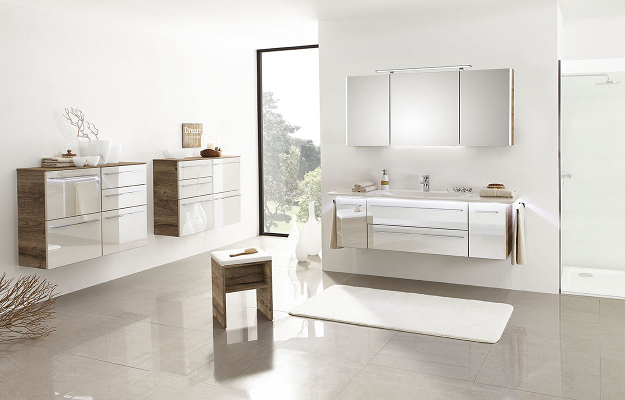 Für Liebhaber des markanten Designs empfiehlt sich das Programm "109". Ob aus Mineralmarmor oder filigranem Glas in Weiß: Durch das Zusammenspiel von Glanz und warmen Holz sticht der Waschtisch optisch hervor. Die Glasmetallic-Fronten verleihen gemeinsam mit den Holzdekoren dem Bad einen eleganten und hochwertigen Charakter und erzielen durch die Glasabdeckplatten der Beimöbel ein stimmiges Gesamterscheinungsbild.
