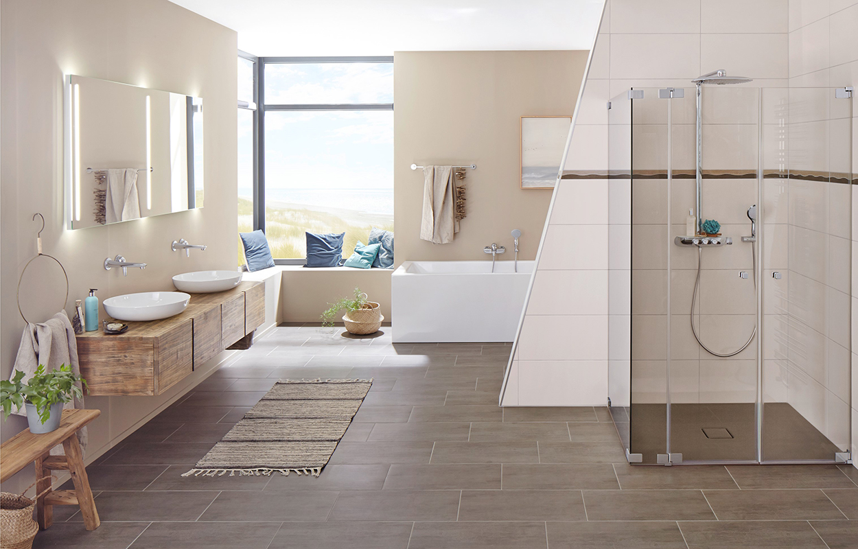 Zwischen Homeoffice, Kinderbetreuung und sonstigen Alltagspflichten bleibt oft wenig Raum für Entspannung und wohltuende Momente. Dabei ist vor allem das private Bad als Ort des Rückzugs und der Stille bestens geeignet, neue Kraft zu schöpfen. Gut abgestimmte Farbkonzepte mit wenig Kontrasten und sensible Beleuchtungskonzepte helfen beim Wohlfühlen. Glas und Keramik dienen dabei als raffiniertes Akzentmaterial.