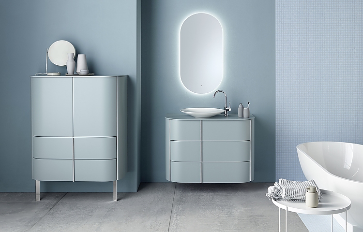 Das zeitlose Design der Kollektion "Lavo 2.0" von Burgbad schließt an die klassische Moderne an. Die Kollektion vereint unauffällig Moderne und Tradition, runde und eckige Formen, Symmetrie und Asymmetrie, geschlossenen und transparenten Stauraum. Selten wurden Gegensätze so harmonisch miteinander kombiniert. Das Oval schmiegt sich flach an die Wand, runde Fronten gehen fast unmerklich in gerade Seitenwangen über, kühles Grau trifft auf warmes Akzentlicht und Messing-farbige Accessoires. Tag trifft auf Nacht, Sonne auf Mond.