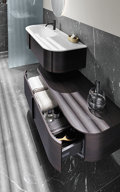 Dass die Kollektion so einen „möbeligen" Charakter hat, kommt nicht von ungefähr. Dreh- und Angelpunkt des Programms ist der Schrank. Egal, ob wandhängend als Waschtischunterschrank, Konsole oder rechteckiger Hochschrank, oder auf schlanken Alu-Füßen an der Wand lehnend wie der halbhohe, mit gerundeten Flügeltüren versehene Vitrinenschrank – in Form und Anmutung könnten die Schränke genauso gut in Wohn- oder Esszimmer, Diele oder Schlafzimmer stehen. Das liegt auch an den hochwertigen, softmatten bis hochglänzenden Oberflächen, aktuellen Holzdekoren und Details wie den vertikalen Akzenten, die durch Griffleisten und seitliche Schattenfugen und Lisenen gesetzt werden.