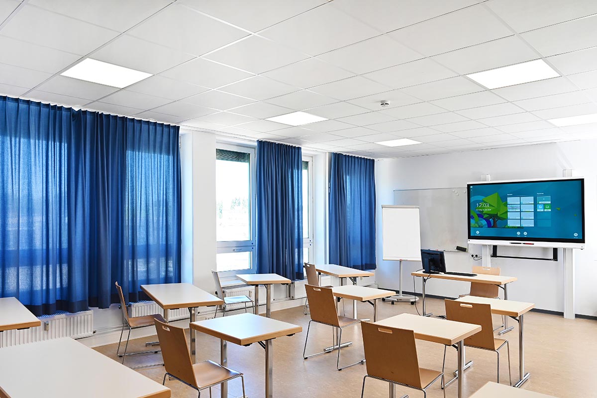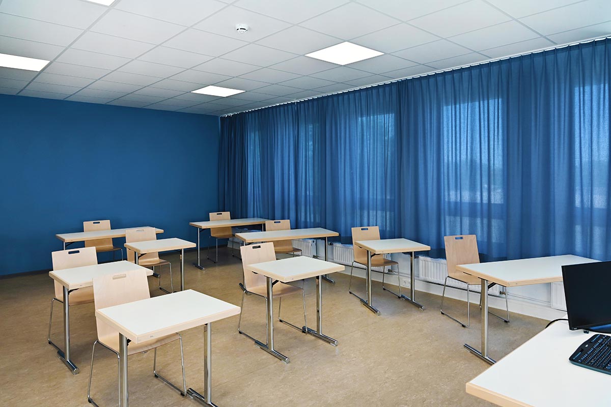 Insgesamt kamen 1,4 km des "Faux-Uni 109" zum Einsatz. Passend zur Akzentfarbe der Stirnwand wurde in den Unterrichtsräumen ein beruhigendes Blau gewählt. In den Büros und Konferenzräumen der Verwaltung hängt ein helles, trendiges Grau vor den Fenstern. An sonnigen Tagen spendet der semi-transparente Stoff Schutz vor der Sonne, während die Räume weiterhin hell bleiben. Ausgestattet mit der intelligenten Zusatzfunktion "drapilux air" sorgen die Textilien zudem für eine gute Raumluft. Metallsalze, die in die Stoffe eingearbeitet sind, brechen Geruchsmoleküle auf und verwandeln sie in unbedenkliches Kohlenstoffdioxid und Wasser. Auf diese Weise werden schlechte Gerüche permanent abgebaut. "Wir sind sehr zufrieden mit den neuen Räumlichkeiten", so Judith Sefzik. „Die helle, freundliche Atmosphäre schafft eine wunderbare Lernumgebung."
