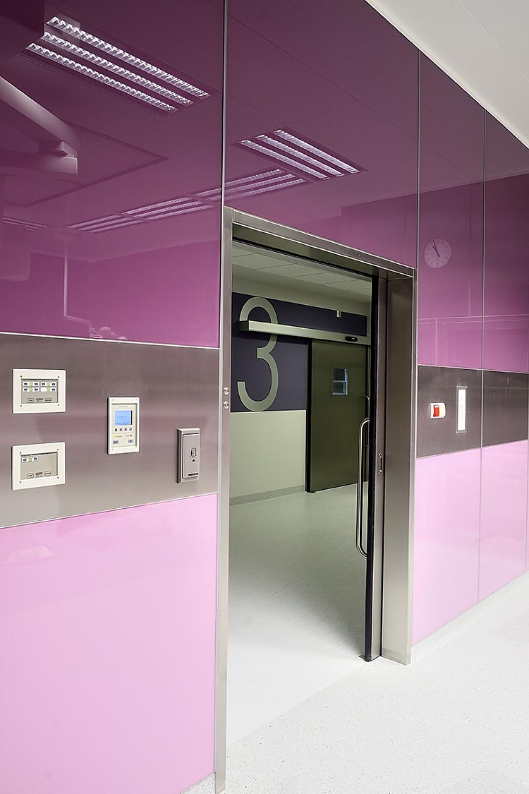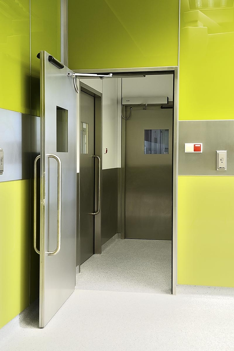 OPs und Intensivstationen sind in Bezug auf Hygiene die sensibelsten Klinikbereiche. Hier müssen Türen sehr schnell und zuverlässig barrierefrei öffnen und dicht schließen. Die großen und schweren Türflügel an den weit öffnenden Zugängen zum größten Hybrid-Operationssaal des CMHI wurden darum mit hermetisch-dichtschließenden automatischen "Powerdrive HT"-Schiebetürantriebssystemen ausgestattet. Sie bilden im letzten Abschnitt des Schließvorgangs eine hermetische Abdichtung mit dem umlaufenden Profil. Dafür sorgt das Zusammendrücken von Spezialdichtungen, die umlaufend am Türflügel angebracht sind. Die Powerdrive-Türsysteme sind auch in der Lage, große und bis 200 kg schwere Schiebetürflügel zu bewegen. Dazu gehören die Spezialtüren im Röntgenbereich, wo eine zuverlässige Strahlenabschirmung gewährleistet sein muss.
