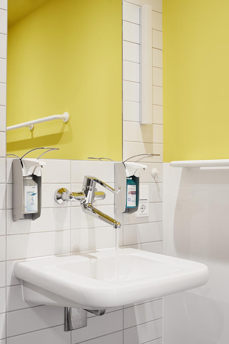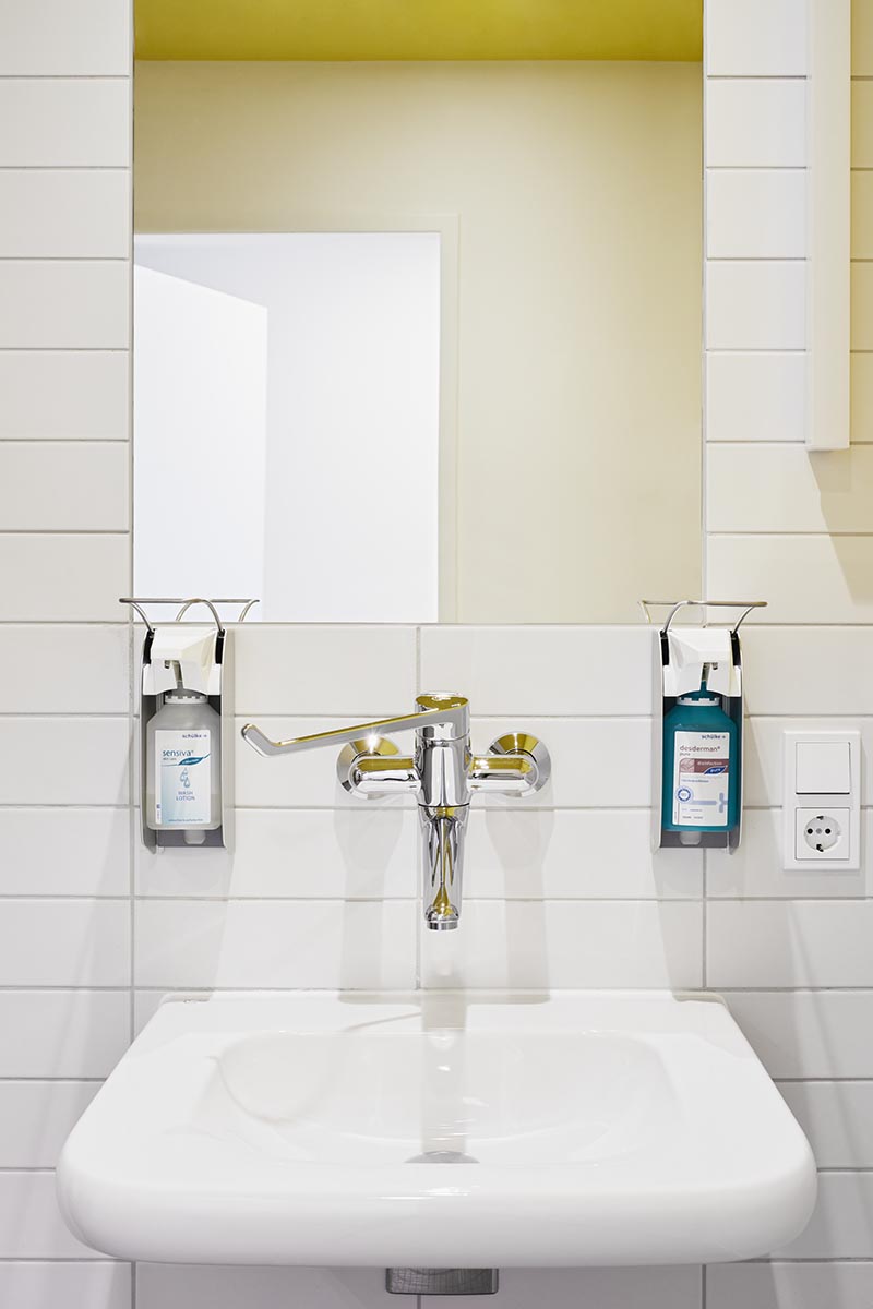 Die Anforderungen, die das RZMH an diese Produkte stellt, sind vielfältig. Haltbarkeit gegenüber Desinfektions- und Reinigungsmitteln, die üblicherweise in Krankenhäusern angewendet werden, ist selbstverständlich. Worauf es darüber hinaus etwa im Hinblick auf die Hygiene ankommt, zeigen zum Beispiel die "Cube"-Waschtische ohne Überlauf: Auf ihrer "IdealPlus"-Oberflächenbeschichtung perlen Wasser und Schmutz ab. „Auch die randlosen ,Connect'-WCs sind aus hygienischer Sicht besser, sie verschmutzen nicht so schnell und sind schnell zu reinigen", so Michael Stiegemann, Beauftragter für Medizinproduktesicherheit. Ulrich Gaschler ergänzt: "Wir haben bei der Planung diese Qualitäten angefordert, weil sich diese Investition langfristig im Betrieb gerade bei der Gebäudereinigung schnell rentiert."