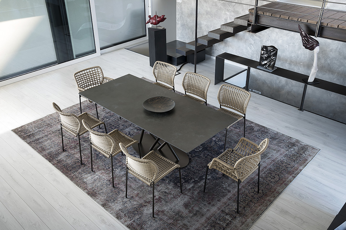 "Corda" lässt sich gut in jede Umgebung integrieren – von modern bis klassisch – sei es für die Außenterrasse eines Hauses oder im Esszimmer, die Terrasse am Meer, für den Einsatz innerhalb oder außerhalb eines Chalets und sogar am Pool oder in Nassräumen kann "Corda" eingesetzt werden. Rahmen und Seil sind wetterfest, sowohl in den kalten als auch in den warmen Jahreszeiten.