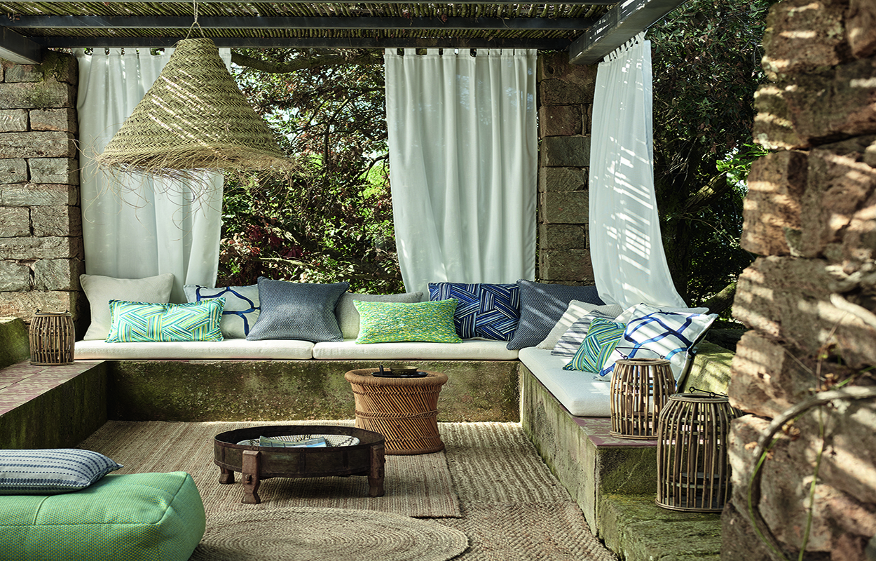 "Splash", die neue Kollektion von Outdoor-Stoffen von Zinc ist fröhlich und farbenfroh. Dekorative Streifen, griffiges Bouclé und Statement-Prints, die solo genauso leicht, souverän und einzigartig wirken wie in harmonischer Kombination, machen "Splash Outdoor" zu einem unkonventionellen und zugleich vielseitig verwendbaren Designpartner für die Außenraumgestaltung. Die Stoffe sind lichtecht und UV-beständig, bei 40°C waschbar sowie schimmel-, fäulnis- und bakterienbeständig. Auf dem Bild zu sehen sind die Stoffe "Zamna" in Chalk, "Hari" in Pool, "Splash" in Ocean, "Buale" in Ocean, "Cossura" in Pool, "Hari" in Ocean, "Gianni" in Ocean und "Buale" in Pool (von links).