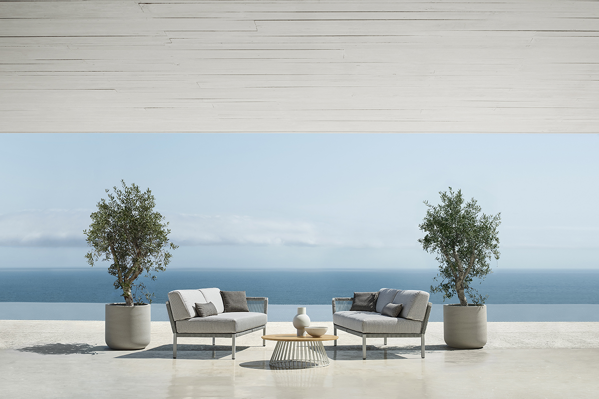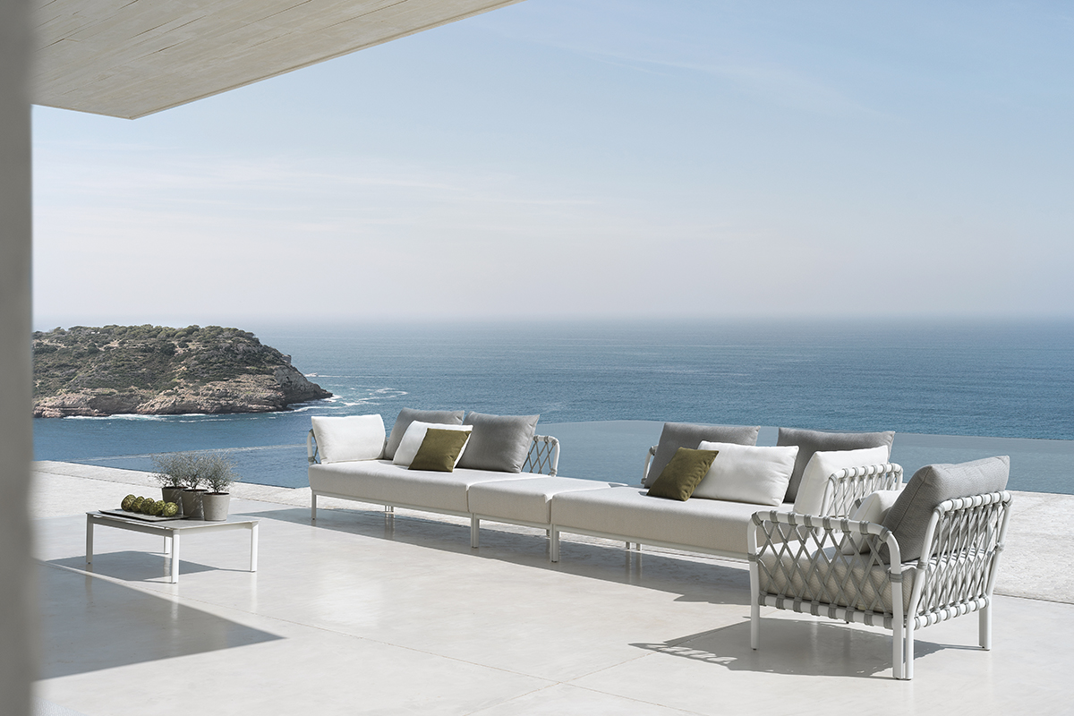 Die in matt weiß beschichteten Aluminiumrahmen von "Caro" (Design: Hoffmann Kahleyss Design) sind aufwendig in einem geometrisch offenen Geflecht aus Outdoor-Seil in Silbergrau umwoben. Zusammen verleihen sie so dieser modularen Sitzgruppe eine elegante Note. Üppige, tiefe Sitzkissen und lässige Wurfkissen laden zum Relaxen ein und sorgen dabei für Outdoor-Luxus pur. Über 20 Stoffausführungen lassen auch hier keine Wünsche offen.