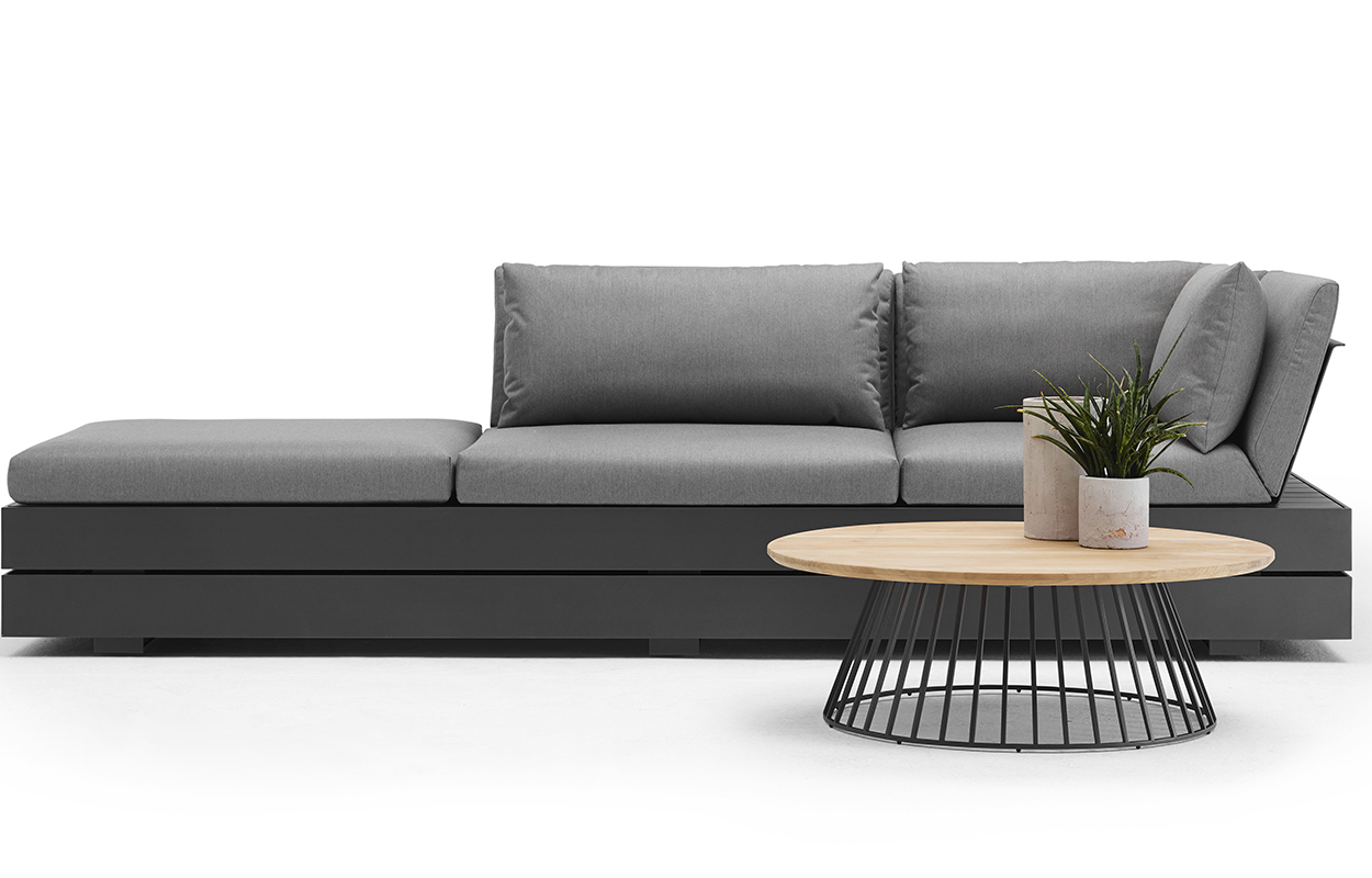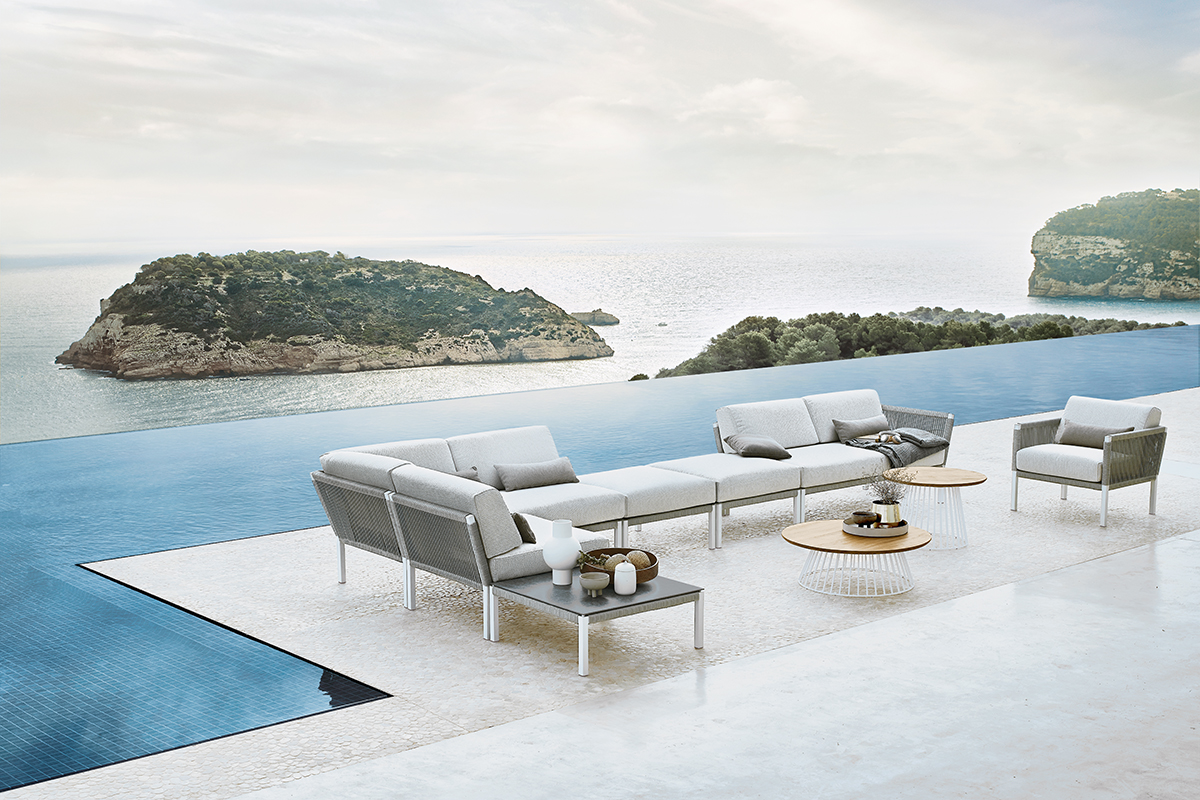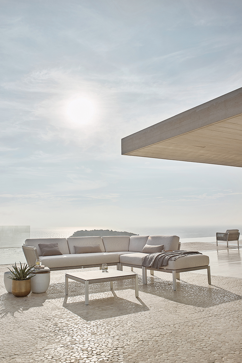 Zwei verschieden große Tische, entweder mit einem farblich passenden Aluminiumtop oder mit kontrastierenden Teak- oder Keramikplatten für einen spannenden, trendigen Materialmix, runden diese stylische Kollektion ab. Alle Module und Tische sind in ihrer Höhe verstellbar (30 cm/35 cm) und lassen sich so individuellen Bedürfnissen anpassen. Um eine perfekte und farblich stimmige Outdoor-Oase zu schaffen, stehen für die Polsterkissen mehr als 20 verschiedene Stofffarben zur Auswahl.