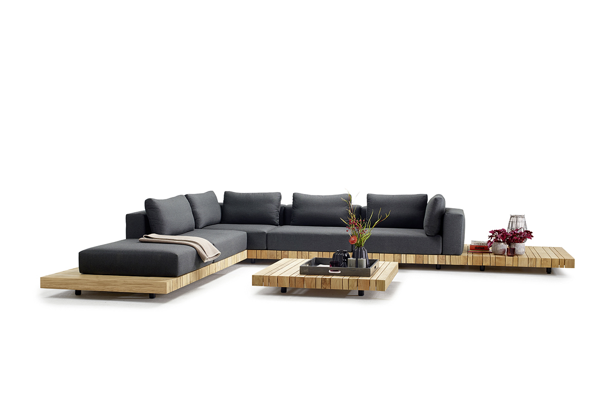 Das Design der Teak-Lounge "Plateau" ist geprägt durch eine optisch schwebende massive Teak-Plattform die eine einladende kubische Polsterlandschaft trägt. Das Teak-Gestell mit unterschiedlich breiten Teak-Latten bildet einen optischen Rahmen für die Polster, welche durch einen innenliegenden Edelstahlrahmen getragen werden.