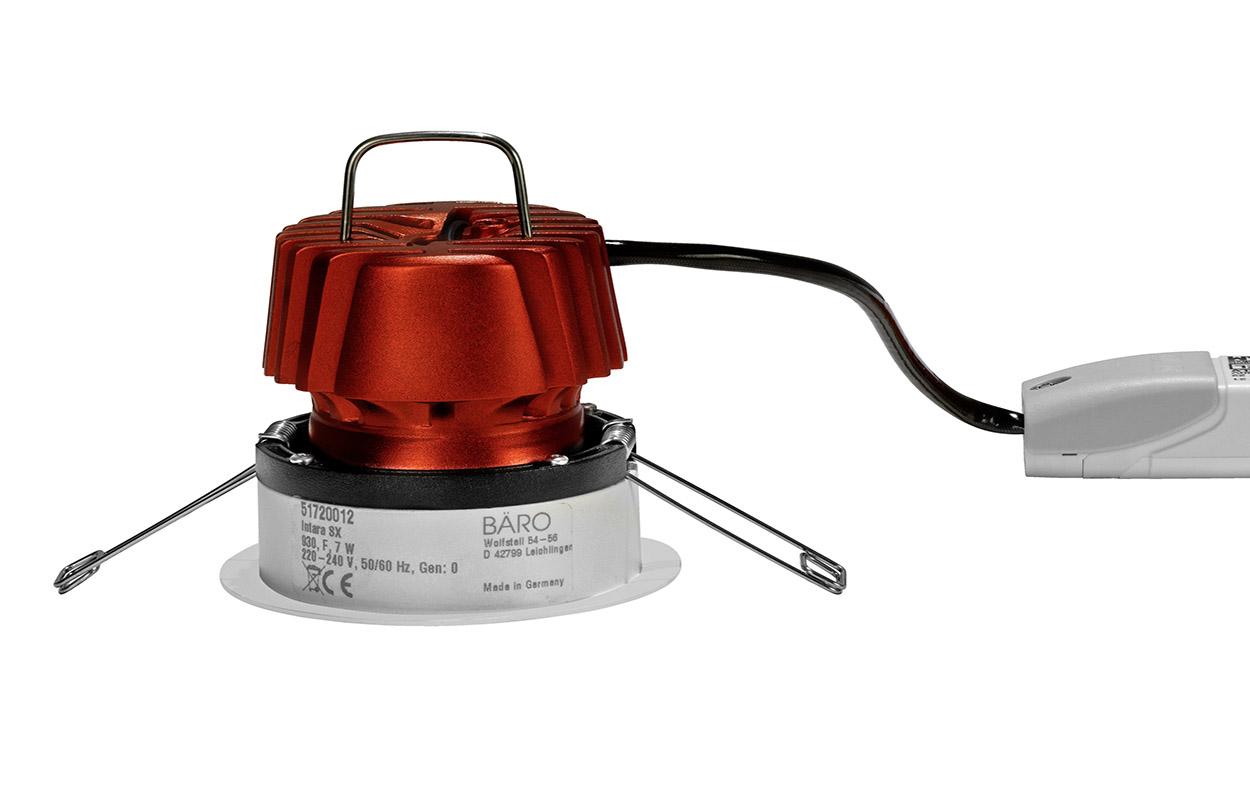 Der rot eloxierte Kühlkörper ist das wohl prägnanteste Designmerkmal der "Intara SX" von Bäro. Doch nicht nur dafür erhielt die Einbauleuchte den German Design Award 2021 in der Kategorie "Excellent Product Design - Lighting". Mit der neuen Serie zeigt Bäro, was mit LED-Technik und modernen Optiken machbar ist: Downlight, Richtstrahler und Wandfluter bieten ungewöhnlich präzise und effiziente Lichtverteilungen mit viel Lichtstrom bei extrem kompakter Bauweise. | ADVERTORIAL