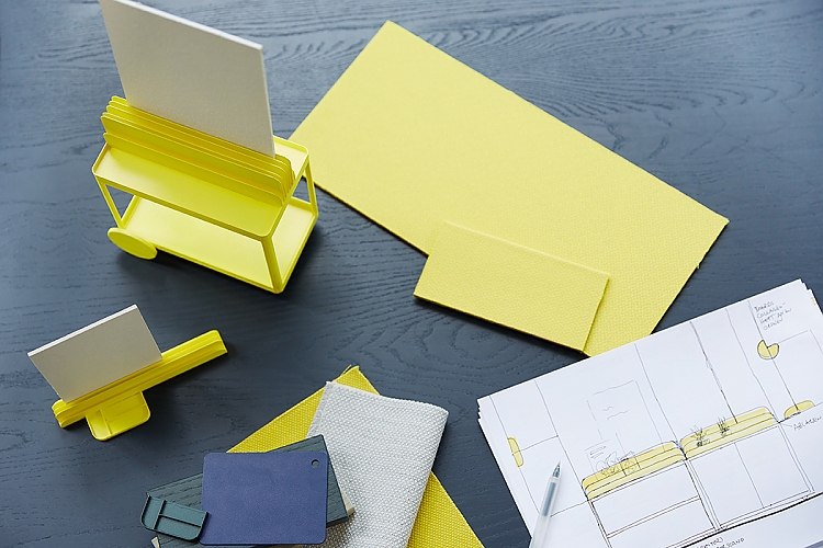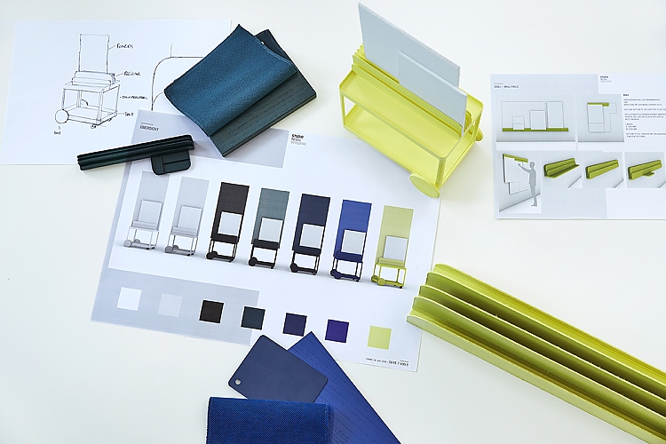 Wir versuchen immer, sehr früh im Projekt eine grundlegende Richtung im Thema Farbe zu legen. Diese wird dann mit den anderen Entwurfsschritten immer weiter verfeinert und ausdifferenziert. Für unsere Kollektion mit Sigel wollen wir eine Palette von nüchterneren, neutralen Farben und emotionaleren Tönen zusammenstellen. Neben den neutralen Weiß- und Dunkelgrautönen sollen ein dunkles Waldgrün und Nachtblau eine gediegene Farbigkeit erzeugen. Mit dem farbstärkeren Gelb und dem Kobaltblau geben wir der Kollektion einen kräftigen, lauten Aspekt. Mit dieser Palette lassen sich feine Gradationen in den Einrichtungskonzepten erzeugen. Es können ruhige, helle Arbeitswelten entstehen, in denen ein einzelner oder wenige farbliche Highlights zu Protagonisten in der Einrichtung werden, oder es können stilvolle Ensembles zusammengestellt werden, in denen eine dezente Farbigkeit in den Räumen vorherrscht. Hier wollen wir den Architekten und Innenarchitekten einen großen, inspirierenden Handlungsspielraum ermöglichen.