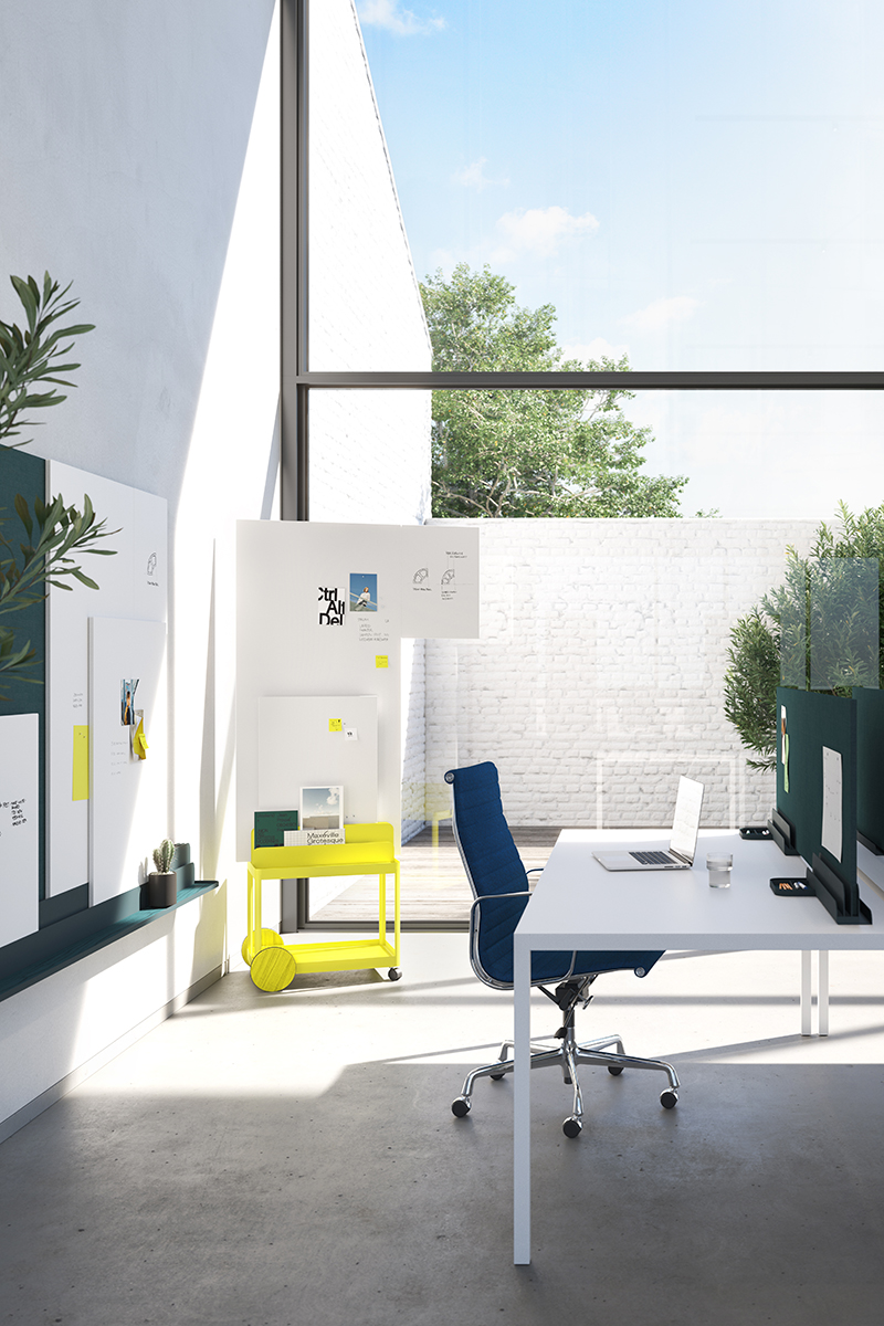 Besau Marguerre: Agilität im Kontext des Büros heißt für uns Flexibilität und Durchlässigkeit. Die Hürde, Ideen freien Lauf zu lassen, sollte möglichst niedrig sein. Gedanken sollen einfach und schnell ihren Weg aus dem Kopf in die Umwelt finden und dort in einen Dialog mit anderen Ideen, Meinungen und Bewertungen treten. Im Zentrum unserer Kollektion stehen die unterschiedlichen, tragbaren Boards, sie sind die Leinwand für unsere Gedanken. Für diese Boards haben wir mit Sigel unterschiedliche Befestigungslösungen entwickelt. Zum einen lassen sich die Boards seitlich miteinander verbinden. So lassen sich Ideen und Gedanken verbinden oder erweitern. Zum anderen können die Boards frei zwischen verschiedenen Orten im Büro hin und her getragen werden – vom Arbeitsplatz in den Meetingraum, vom Workshop zur Präsentation – sowie in kleinen Besprechungen zu zweit, in Teams oder in großen Runden genutzt werden. Die Befestigungslösungen sind im Hinblick auf die unterschiedlichen, räumlichen Anforderungen und Usecases entwickelt. So gibt es wandorientierte Rails, oder die Möglichkeit, die Boards auf einem Tisch oder Sideboard zu positionieren, sowie auf mobilen Wagen. So lassen sich die Boards für alle Bedürfnissen einsetzen und kombinieren.