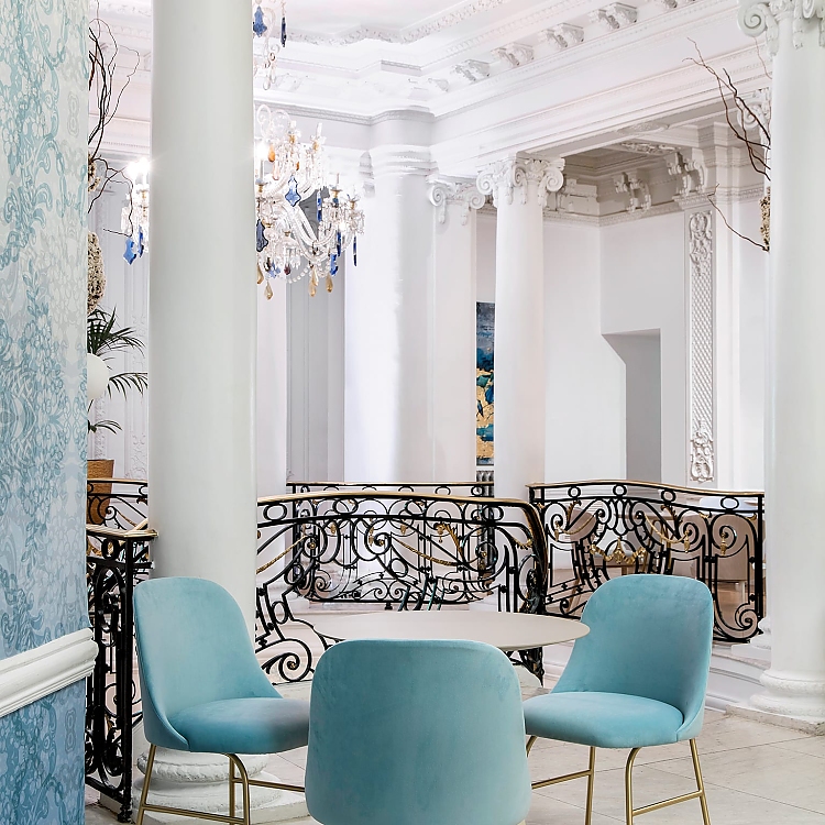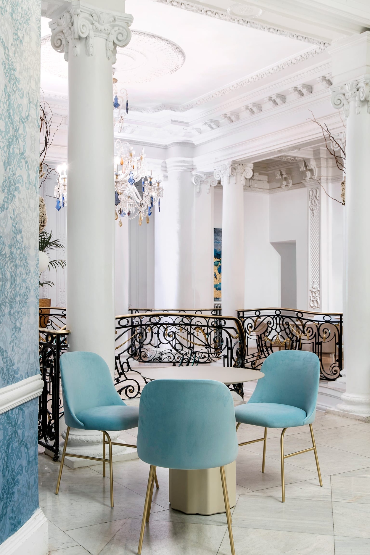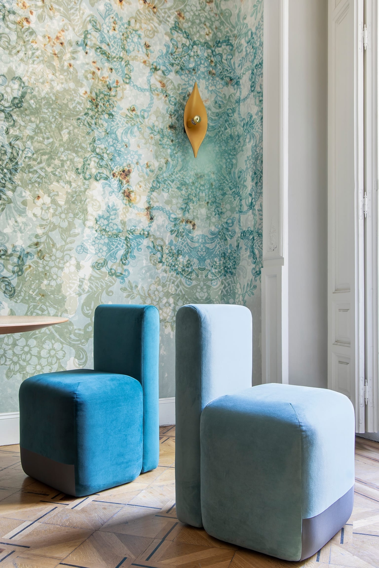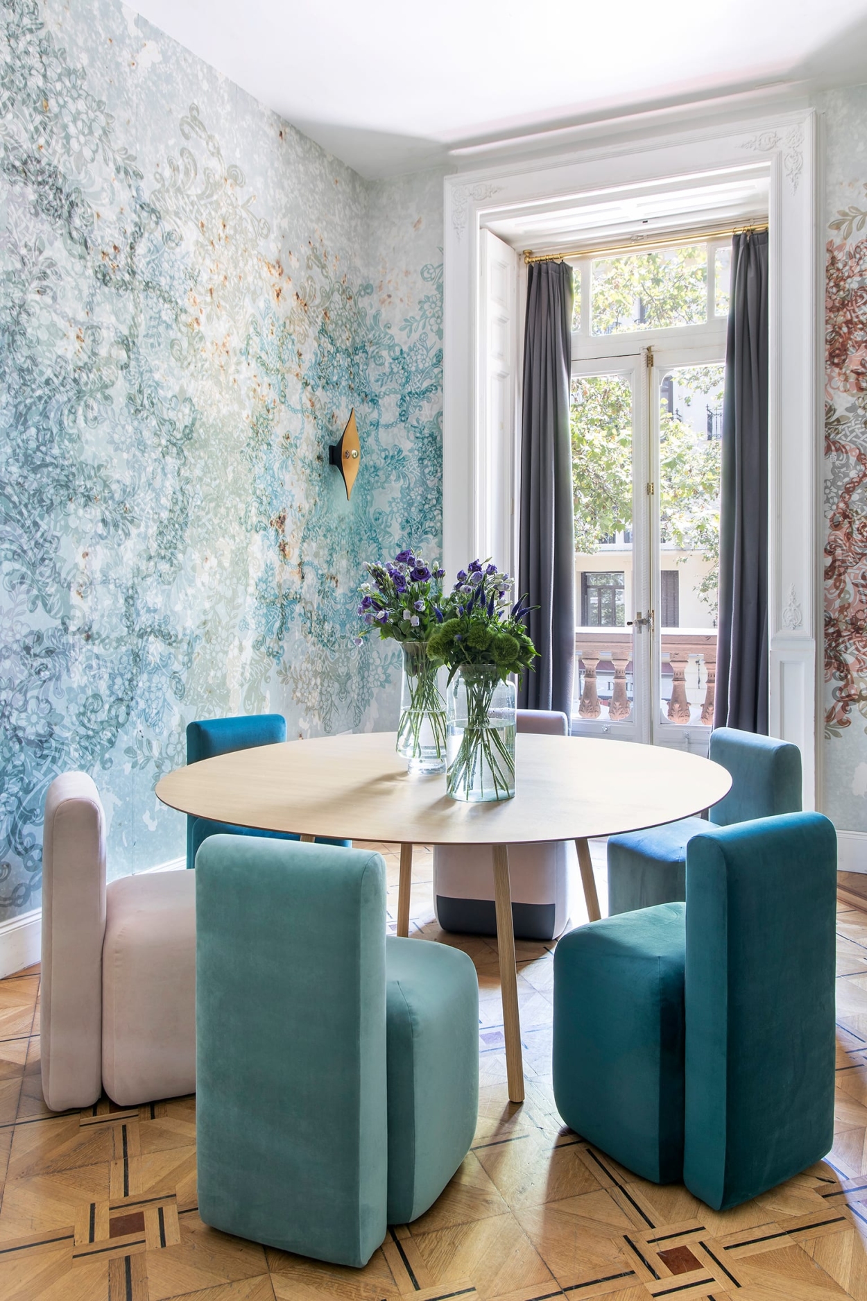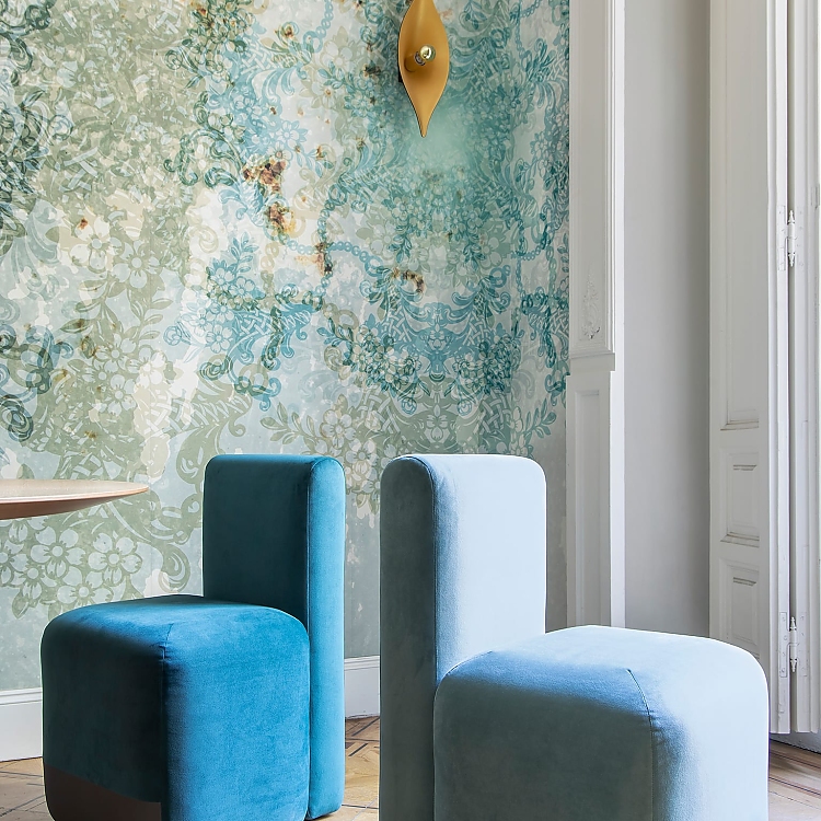 Die außergewöhnliche Ausführung zeigt sich nicht zuletzt an der Wandgestaltung. Das Design "FC.02" ist ein Entwurf von Welcome Design und Teil der jüngsten Tapeten-Kollektion des Studios. In zarten bis wuchtigen Blau- und Meerestönen greift es die Ornamentalität der Stuckbordüren an Wänden und Decken auf und reflektiert sie. Mal sachte, mal mit Verve schreibt es die floralen Bewegungen fort, lässt sie transparent zurücktreten und einander in forschen Wogen überlagern. Nicht von ungefähr mischt sich hier und da eine Assoziation ans Mittelmeer ins Bild vor dem geistigen Auge - das Mittelmeer ist eines der Subthemen des Interiors.
