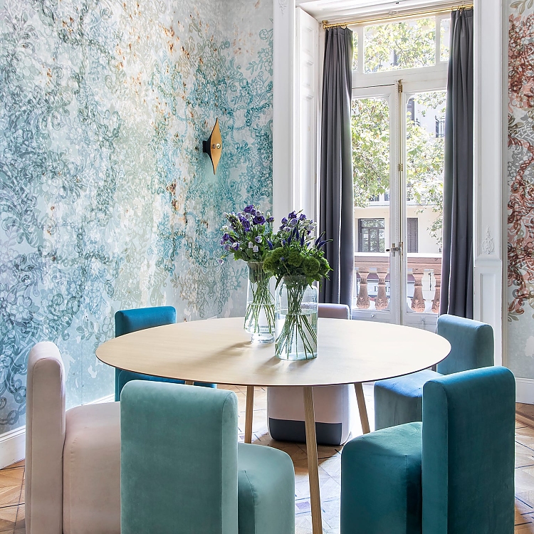 "In unseren Räumen gehen graphische Gestaltung und Interior Design in eine Koexistenz. Dabei sind die Tapeten der Ort, an dem Farben, Transparenz, Geometrie und Florales zusammenfinden und einem Raum seinen je eigenen Charakter verleihen", sagt Víctor Camacho, Graphikdesigner bei Welcome Design.