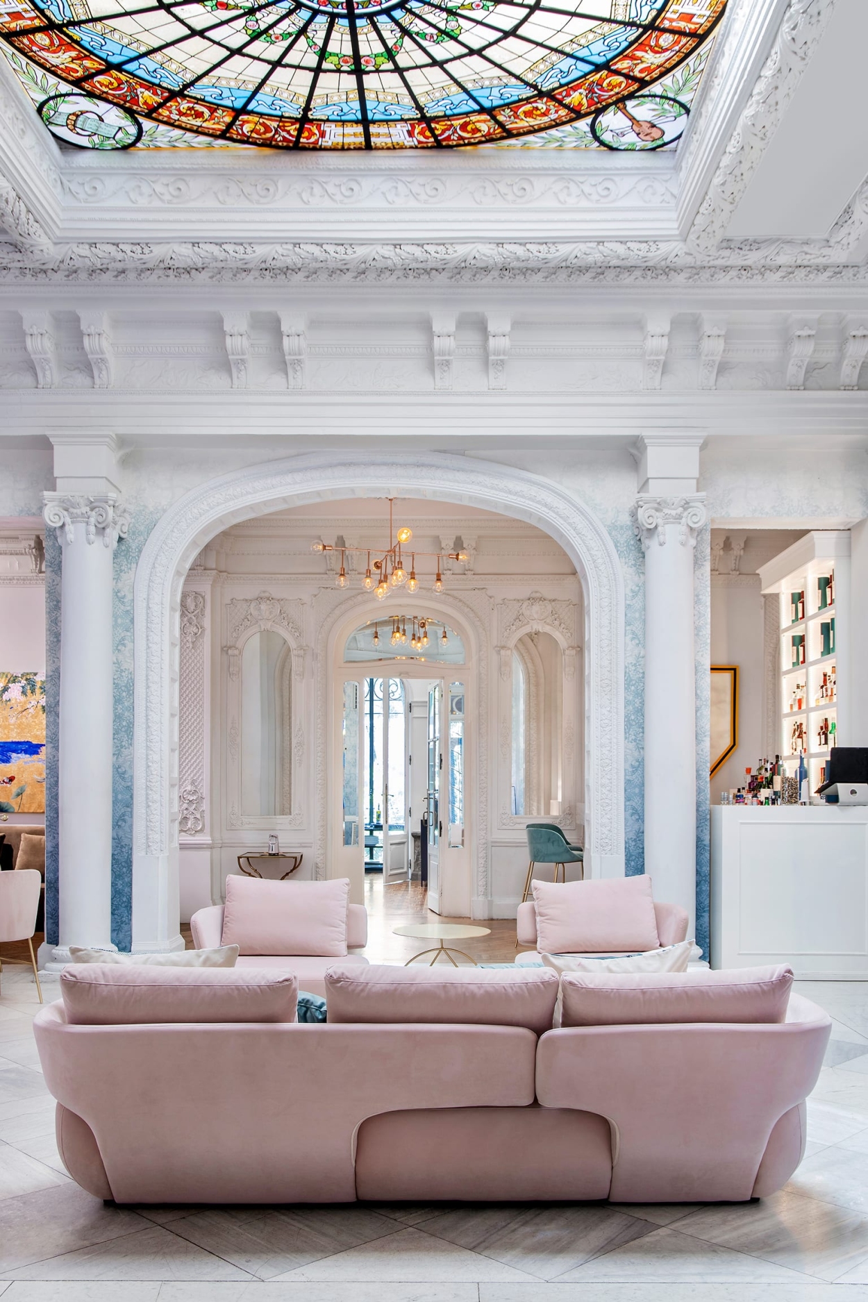 Die Lobby ist in zarten Rosa- und Blautönen gehalten und öffnet sich dem Besucher als weiter, fließender Raum, der nahtlos in die angrenzenden Räume übergeht. Sitzmöbel aus der "Levitt"-Kollektion von Viccarbe im Design von Ludovica und Roberto Palomba unterstreichen die warme und einladende Atmosphäre, die dem Ankommenden sanft umfängt und jeden sozialen Druck herausnimmt.
