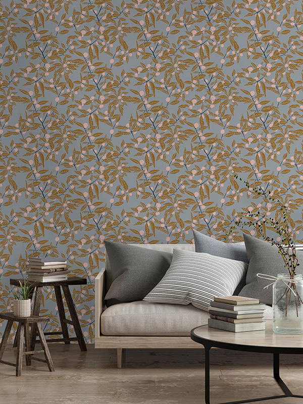 Das Design "Clementine" ist einer der Bestseller der Kollektion "Poème" von Tenue de Ville. Freskengleich und inspiriert von Tangerinen, sizilianischen Mandarinenbäumen, versetzt es den Betrachter auf eine Sonnenterrasse am Mittelmeer, wo er über die Brüstung hinweg auf eine Zitrusplantage blickt. Die Farbgebung aus Puderpink, Entenblau, Seegrün, Vintageorange und einigen Sepiatönen ist typisch für die Kollektion, die aus leicht abstrahierten, wiederkehrenden Mustern weite Panoramen zusammenfügt. Jedes Design der Kollektion ist handgemalt und wird erst auf Anfrage gefertigt. Damit möchte die Künstlerin Alexia de Ville ihrem Ziel der Zero-Waste-Produktion näher kommen.