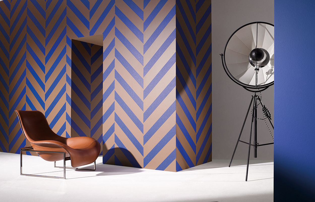 Es ist ein Klassiker in der Damen- wie Herrenmode und flaniert über die Laufstege als Anzug, Jacke oder Mantel: "Fischgrät", englisch "Herringbone". Als Textil eher kleinformatig, wird es an der Wand im großen Maßstab zum Blickfang. Dafür dass der Look, den schon Humphrey Bogart und Kathrin Hepburn ins Rampenlicht rückten, nun im Ambiente die Blicke auf sich zieht, sorgt die Marburger Tapetenfabrik mit der neuen "Signature"-Kollektion vom Amsterdamer Designer Ulf Moritz. Moritz wird auch respektvoll der „Stoffmagier" genannt. Seine Tapeten-Designs halten den mustergültigen Auftritt wahlweise in klassischem Schwarz-Weiß oder in warmem Ultramarin-Kupfer. | marburg.com