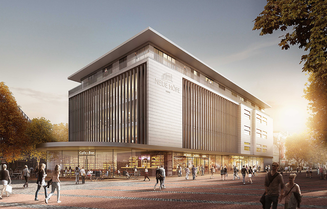 Nach der Revitalisierung soll das ehemalige Hertie-Kaufhaus in Herne zum neuen Anziehungspunkt der Innenstadt werden. | Visualisierungen: Landmarken AG