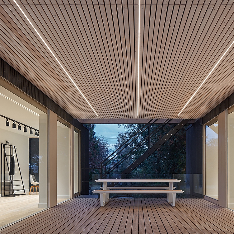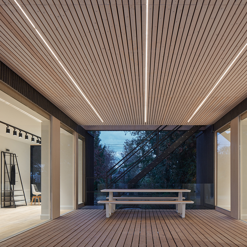 Die durch die Stapelung entstandene, überdachte Terrasse gibt dem Besucher nun schon beim Ankommen wie durch ein Tor den Blick auf den gegenüberliegenden See in der Parkanlage frei. Der Eindruck, sich auch im Inneren des Showrooms wie unter freiem Himmel zu bewegen, wird durch die großzügigen Verglasungen und das subtile Beleuchtungskonzept noch verstärkt.