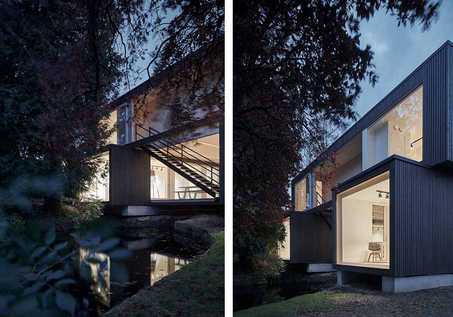 Entstanden ist ein weitläufiger, offener Raum mit viel Tageslichteinfall auf 200 Quadratmetern und zwei Etagen. Dazu errichtete das Team von Ark-Shelter, dem belgisch-slowakischen Büro für modulare Architektur, auf einem Betonfundament im Garten des Firmengeländes fünf fix und fertig ausgekleidete CLT-Holzcontainer, die von großzügigen, bodentiefen Wand- und Frontverglasungen durchsetzt sind.