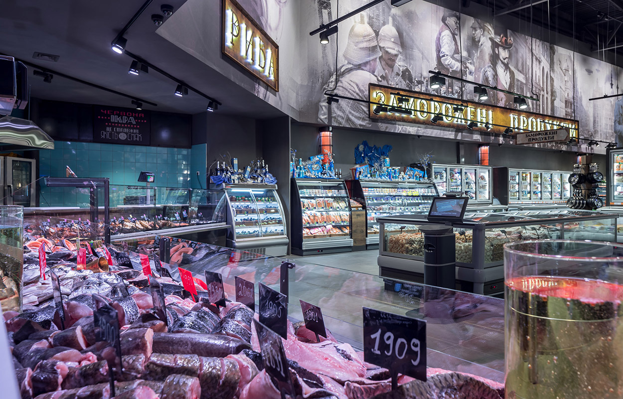 Das Storedesign von Silpo und die Beleuchtung als Medium des nimmt die Kunden beim Einkauf mit auf eine fantastische Reise, bei der wie nebenbei die unterschiedlichen Waren auf jeweils bestmögliche Weise präsentiert werden.