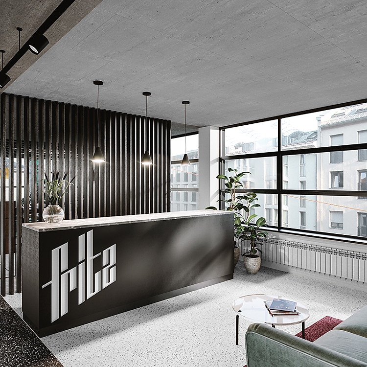 Zur Revitalisierung des Bürokomplexes "Fritz" im Süden des Münchner Hauptbahnhofs wurde das Bestandsgebäude bis auf den Rohbau rückgebaut. Dieser stand auch im Zentrum des Marketingauftritts der Sales-Lounge: Statt wie bei einem klassischen Showroom eine Musterwohnung zu zeigen, entschied sich das Projektteam, die Wirkung des Rohbaus in Verbindung mit Architekturskizzen und einem eigens gedrehten Kurzschauspiel in Szene zu setzen.