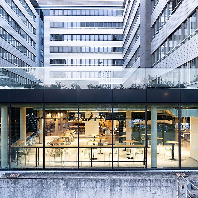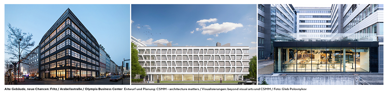 Für das Refurbishment des Olympia Business Center, einem 41.000 qm großen Bürogewerbebaus aus den späten neunziger Jahren, hat CSMM im Auftrag des Projektentwicklers Bayern Projekt den mehrere Gebäudeteile umfassenden Komplex um moderne, notwendige und inspirierende Räume, aber auch Infrastrukturen und Funktionen ergänzt. Neu sind eine offene Lobby, viel Grün, smarte Vernetzung und digitale Serviceangebote. Statt nur eines Großmieters arbeiten künftig viele Unternehmen in dem Gebäude. Mit dem grünen Biotop und Münchens erstem gemeinschaftlich nutzbaren Mitarbeiterrestaurant mit Konferenz- und Co-Working-Angebot hat CSMM ein tradiertes, konventionelles Bürogebäude in eine neue Nutzungsphase überführt.