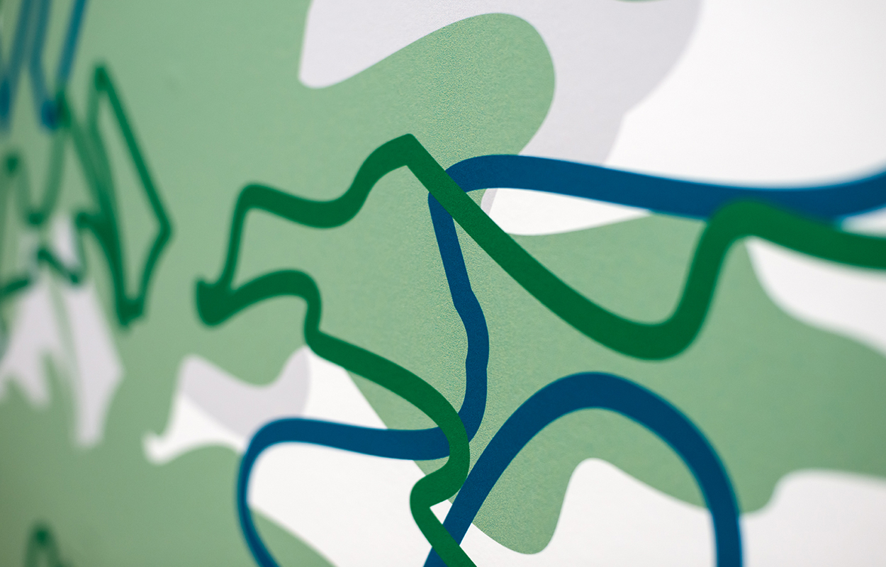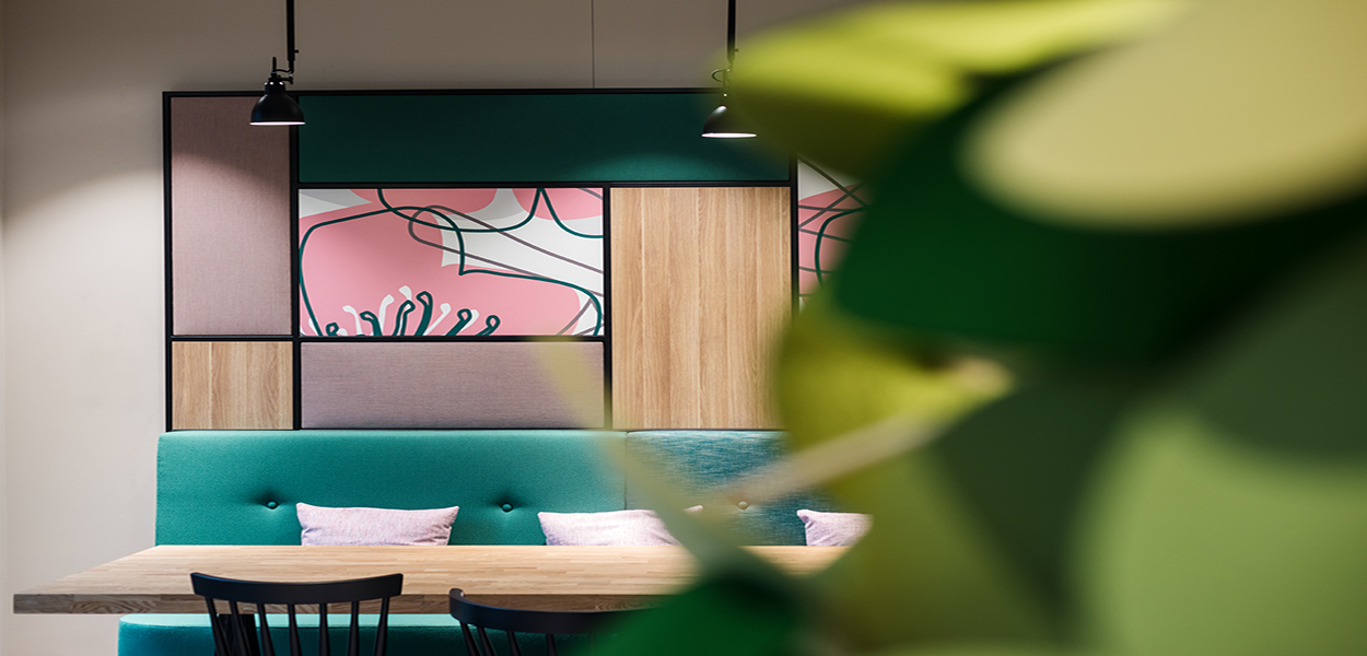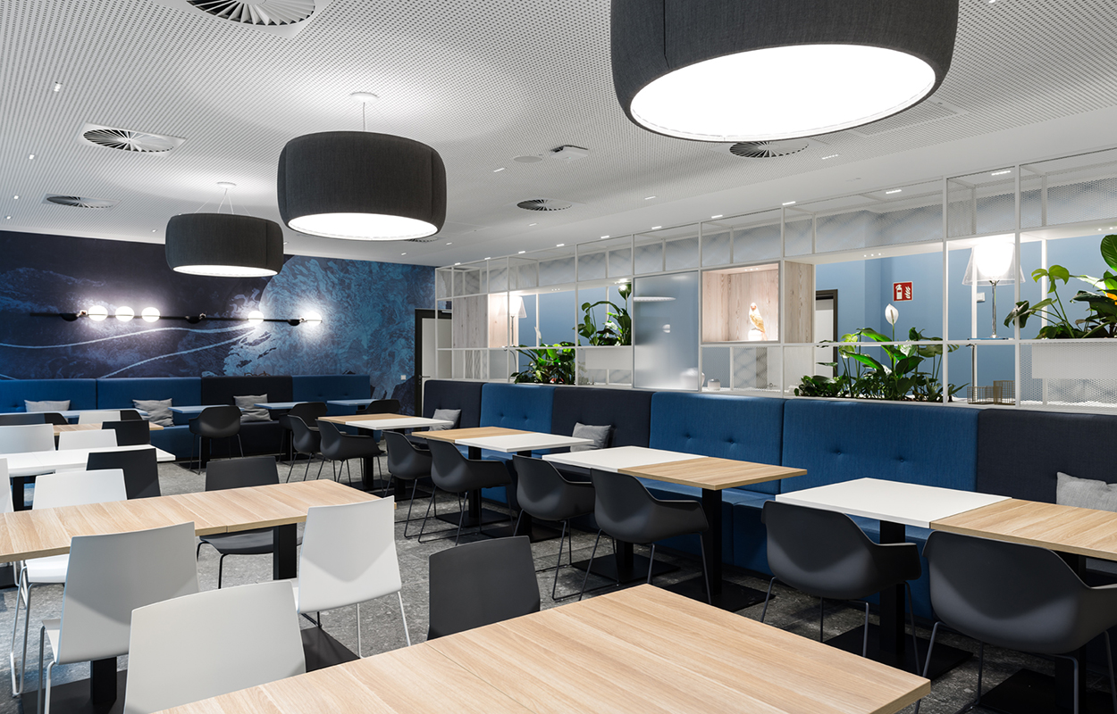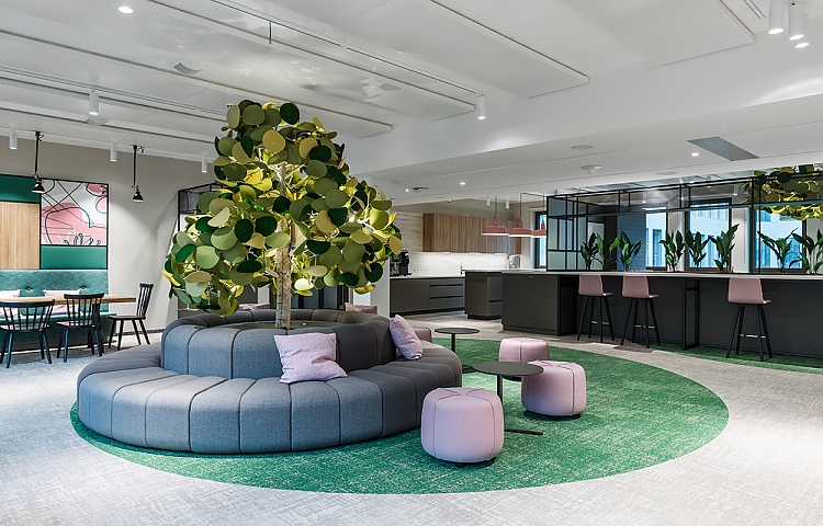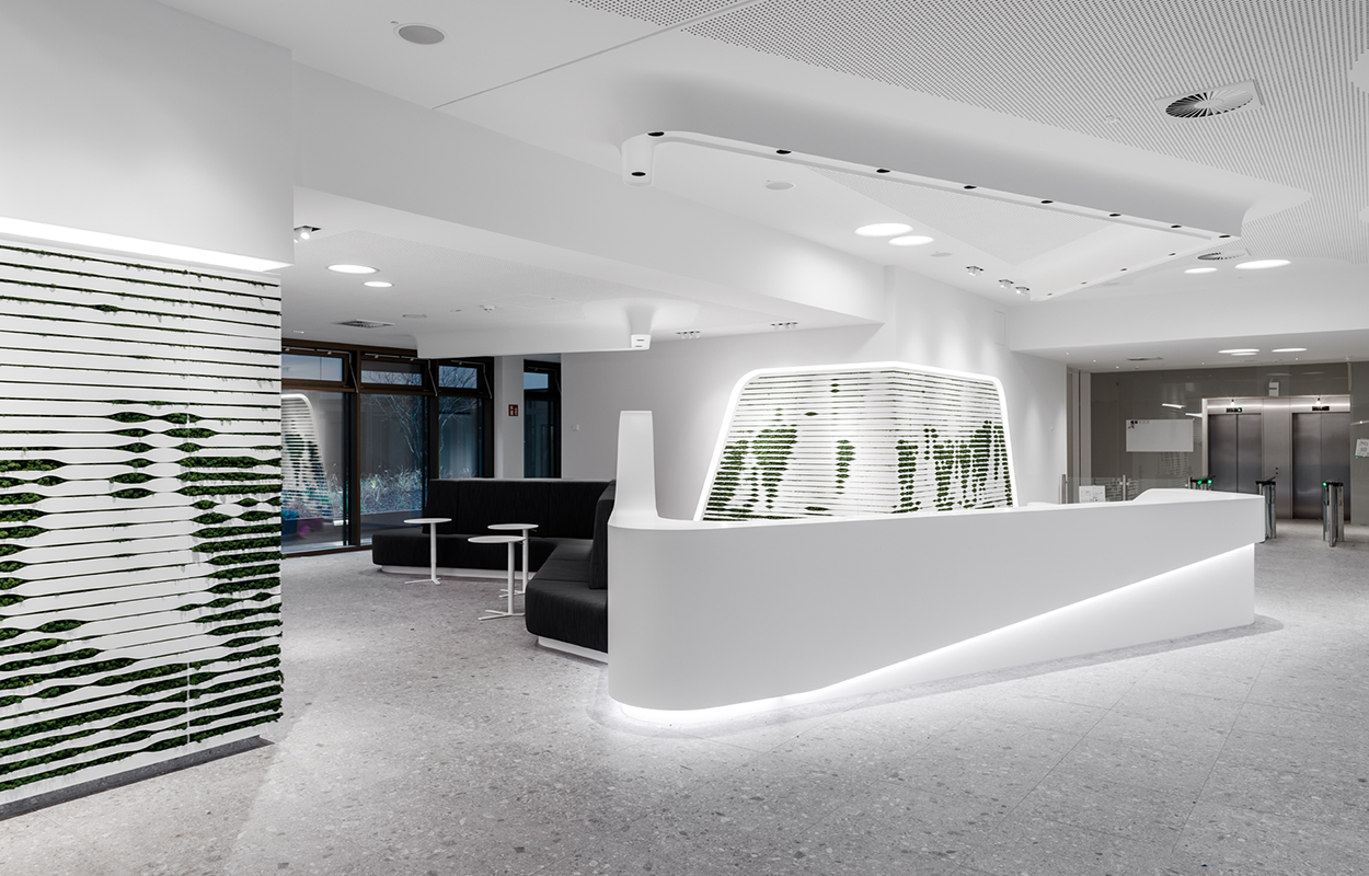 Der ausgewogene Design-Mix aus biophilen Farben, Formen, Strukturen, großflächigen Grafiken und dem Einsatz natürlicher Pflanzen erweckt positive Assoziationen zur Natur und sorgt nebenbei für optimale Orientierung im Gebäude.