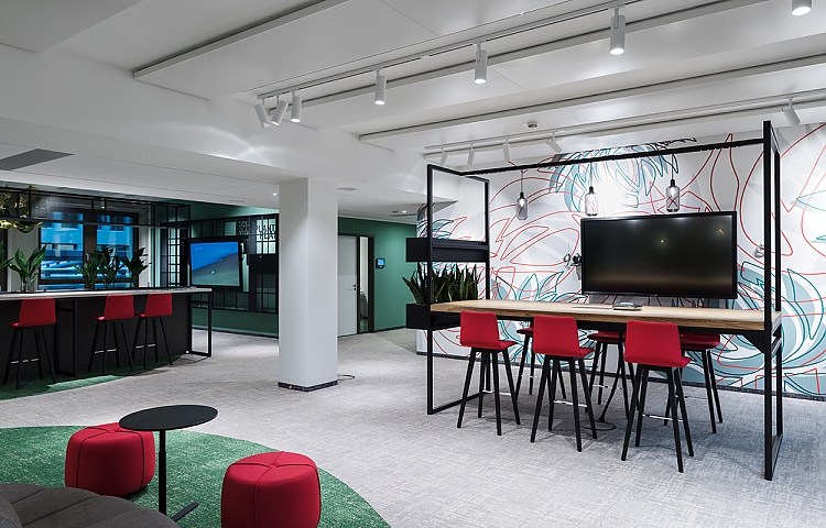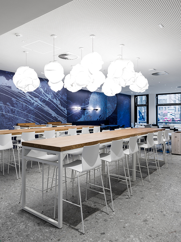 Bei der Entwicklung einer modernen Arbeitswelt spielten außerdem Parameter wie strukturelles Umdenken, flache Hierarchien und Digitalisierung entscheidende Rollen. Die Kommunikation sollte ebenfalls übergreifend und maßgeblich gefördert werden. Deshalb entwickelte sbp identitätsstiftende und abwechslungsreiche Sonderflächen sowie zusätzliche freie Arbeitsmöglichkeiten für alle.