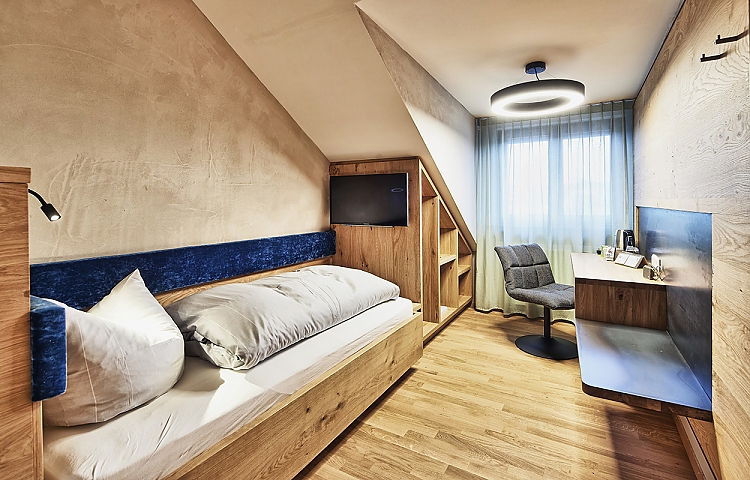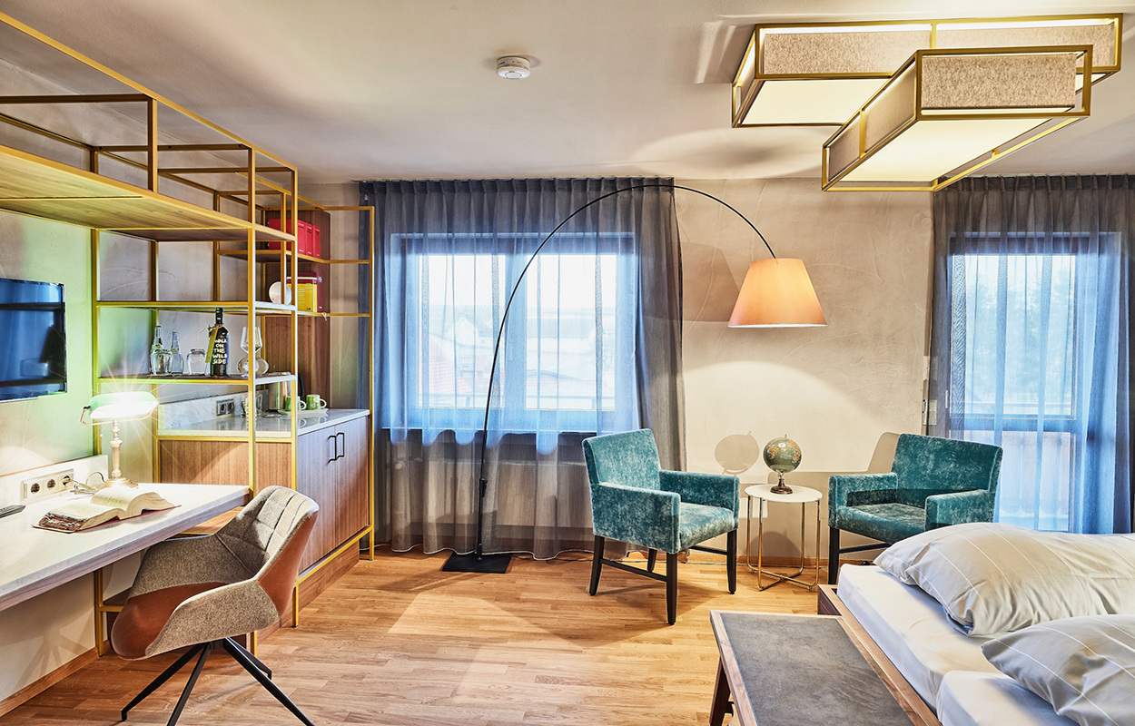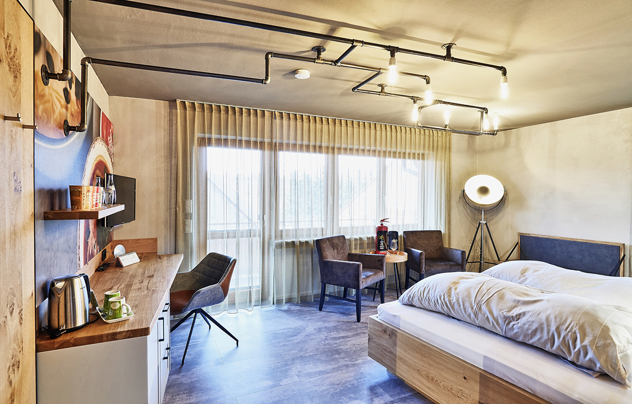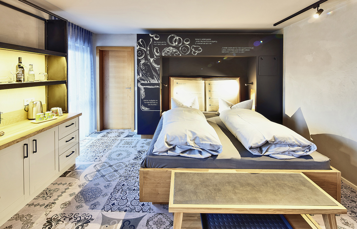 Der Wandputz in seinem dezenten Grau zieht sich als verbindendes Element durch alle sechs Themenzimmer, die ansonsten aber individuell gestaltet sind. Jedes einzelne beleuchtet etwas von der Geschichte und der verschiedenen Aktivitäten des Unternehmens. Im Großeltern-Zimmer wird die Zahl 1950 optisch in Szene gesetzt – eine Referenz an das Gründungsjahr. Im Raum des Küchenchefs Simon Tress gehören Pfannen ebenso zur Wanddekoration wie eine Original-Kochjacke aus dem SWR-TV-Studio.