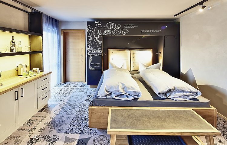 Die Gestaltung des Themenzimmers "Daniel Tress" erzählt von gediegener Esskultur - denn Daniel Tress ist der Restaurantleiter des Hotels. | Fotos: Emoton