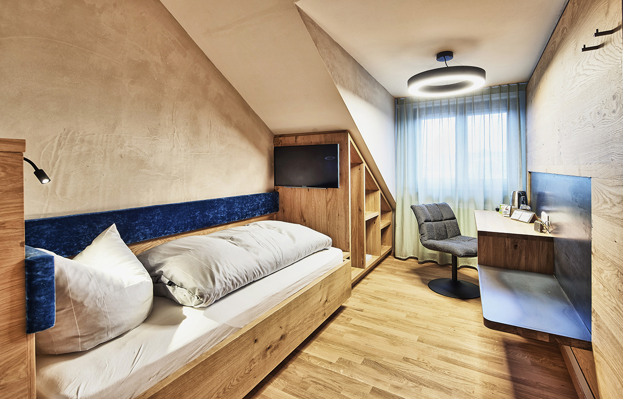 Es sind nicht nur die Vollholz-Möbel, die in den Gästezimmern des Biohotels Rose auf der Schwäbischen Alb ein wohltuendes Raumklima schaffen. Statt der früheren Tapeten setzte die Betreiberfamilie bei der Renovierung der Zimmer auf Wandputz aus reiner Tonerde.