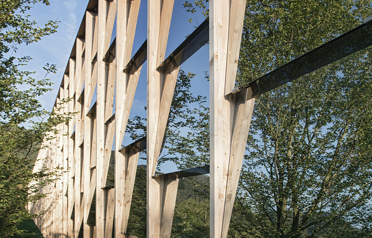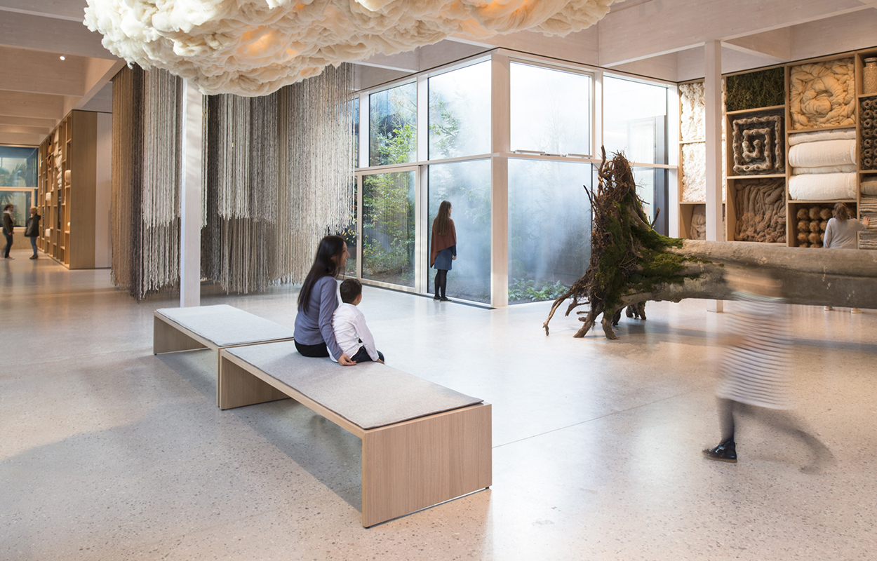 Schon die Erlebniswelt wurde nach ökologischen Grundsätzen aus natürlichen, heimischen Materialien errichtet. Die Fassade besticht durch eine 180m lange Spiegelschindelfassade, deren Spiegelflächen in verschiedenen Neigungen die umliegende natürlich eingebettete Landschaft in der Fassade bildlich aufnimmt und das Gebäude selbst endmaterialisiert wird. Das Gebäude ist mit Schurwolle gedämmt, wird mit Erdwärme und Solarenergie versorgt und ist damit energieautark. Die Neuerrichtung erfolgte auf derselben Grundrissfläche wie das abgebrochene Bestandsgebäude, um keine zusätzlichen Grünflächen zu belasten.